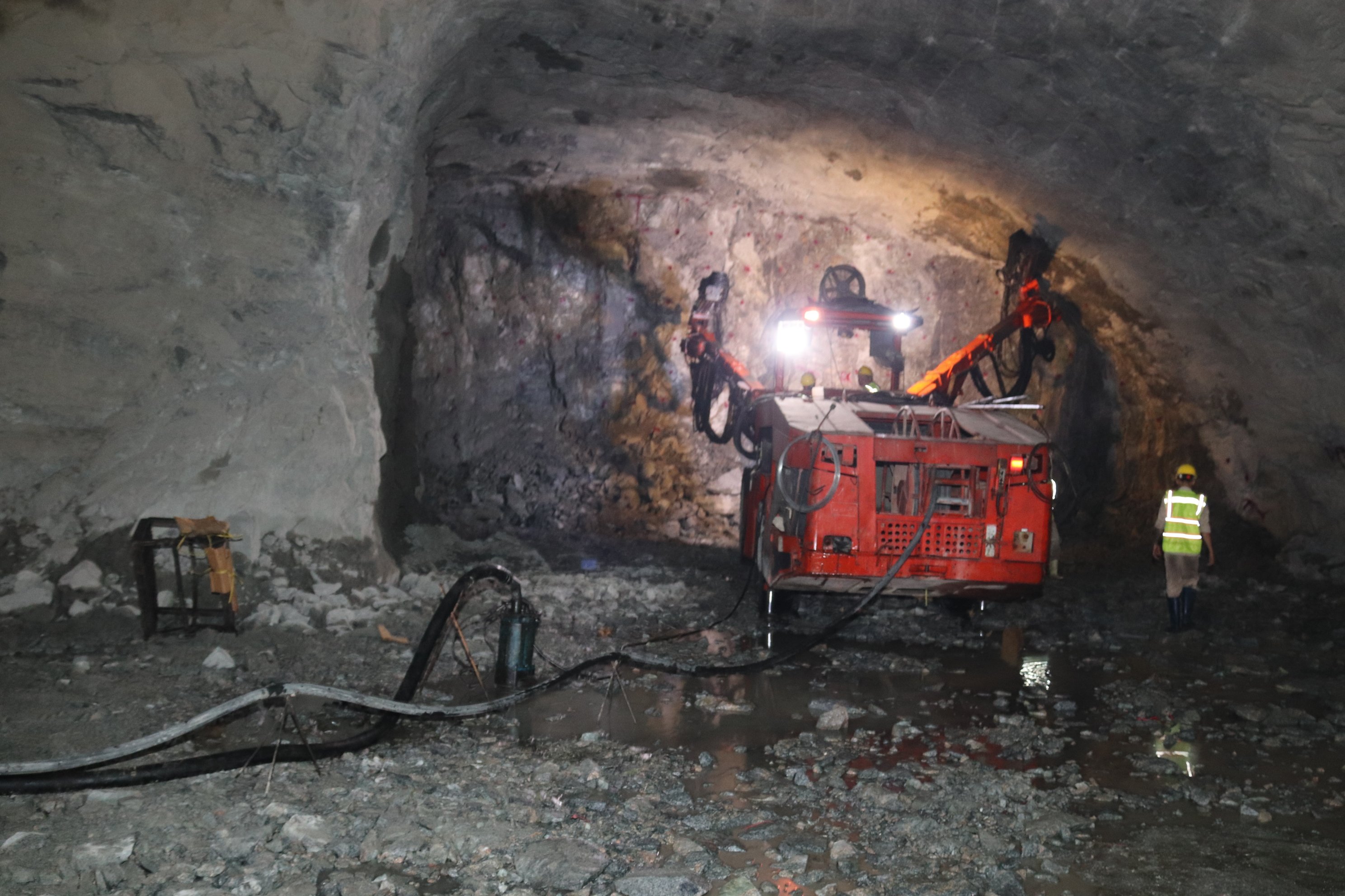 Tại công trường, đoàn công tác đã kiểm tra các hạng mục thi công hầm của dự án: hầm VH3A, hầm cáp điện - thoát gió, hầm thi công - vận hành và cấp gió. Trong ảnh: Đoàn công tác kiểm tra bên trong hầm cáp điện - thoát gió.