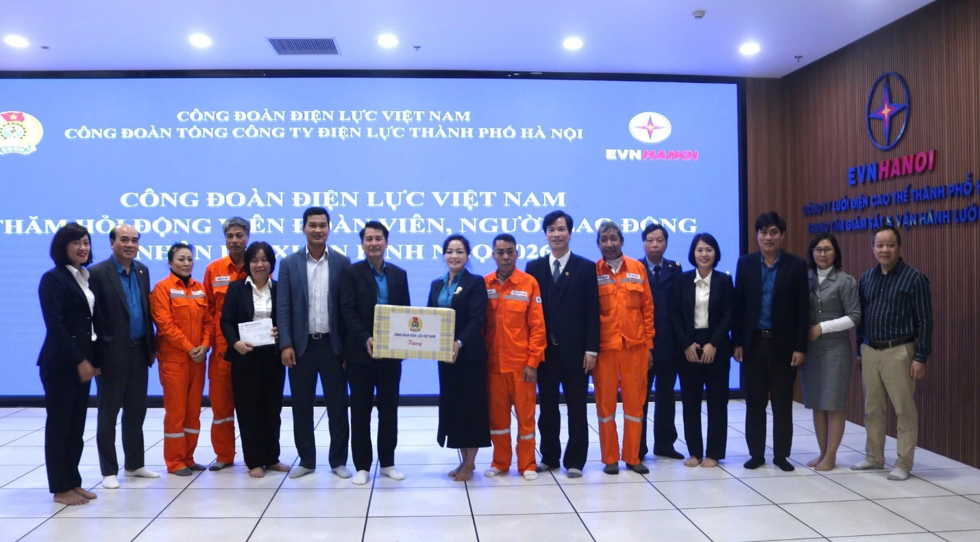 Nhân dịp Tết Bính Ngọ 2026, đoàn công tác của Công đoàn Điện lực Việt Nam (ĐLVN) do đồng chí Đinh Thị Thanh Bình – Phó Chủ tịch Công đoàn ĐLVN làm Trưởng đoàn cùng đại diện các ban chuyên môn Công đoàn ĐLVN đã đến thăm, chúc Tết và trao quà cho đoàn viên, người lao động tại Công ty Lưới điện cao thế TP Hà Nội và Công ty Điện lực Thường Tín.