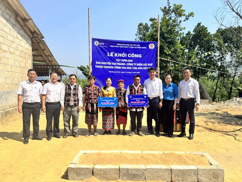 Ngày 31/3, tại xã A Lưới 5, thành phố Huế, Công đoàn Tổng công ty Điện lực miền Trung (EVNCPC) phối hợp cùng Công đoàn Công ty Điện lực Huế đã tổ chức khởi công xây dựng nhà ở theo chương trình hỗ trợ kinh phí xóa nhà tạm, nhà dột nát cho ông Nguyễn Văn Ngành – nhân viên Điện lực A Lưới, Công ty Điện lực Huế, có hoàn cảnh khó khăn.