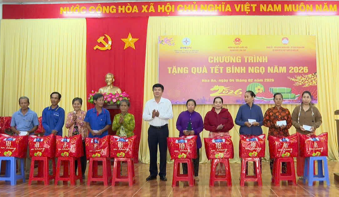 Ngày 4/2, tại hai xã Hòa An và Vĩnh Lợi (thành phố Cần Thơ), Công ty Điện lực thành phố Cần Thơ (PC Cần Thơ) đã phối hợp với Đoàn Đại biểu Quốc hội (ĐBQH) thành phố Cần Thơ tổ chức chương trình thăm hỏi, trao tặng quà Tết cho các hộ nghèo, hộ cận nghèo trên địa bàn.