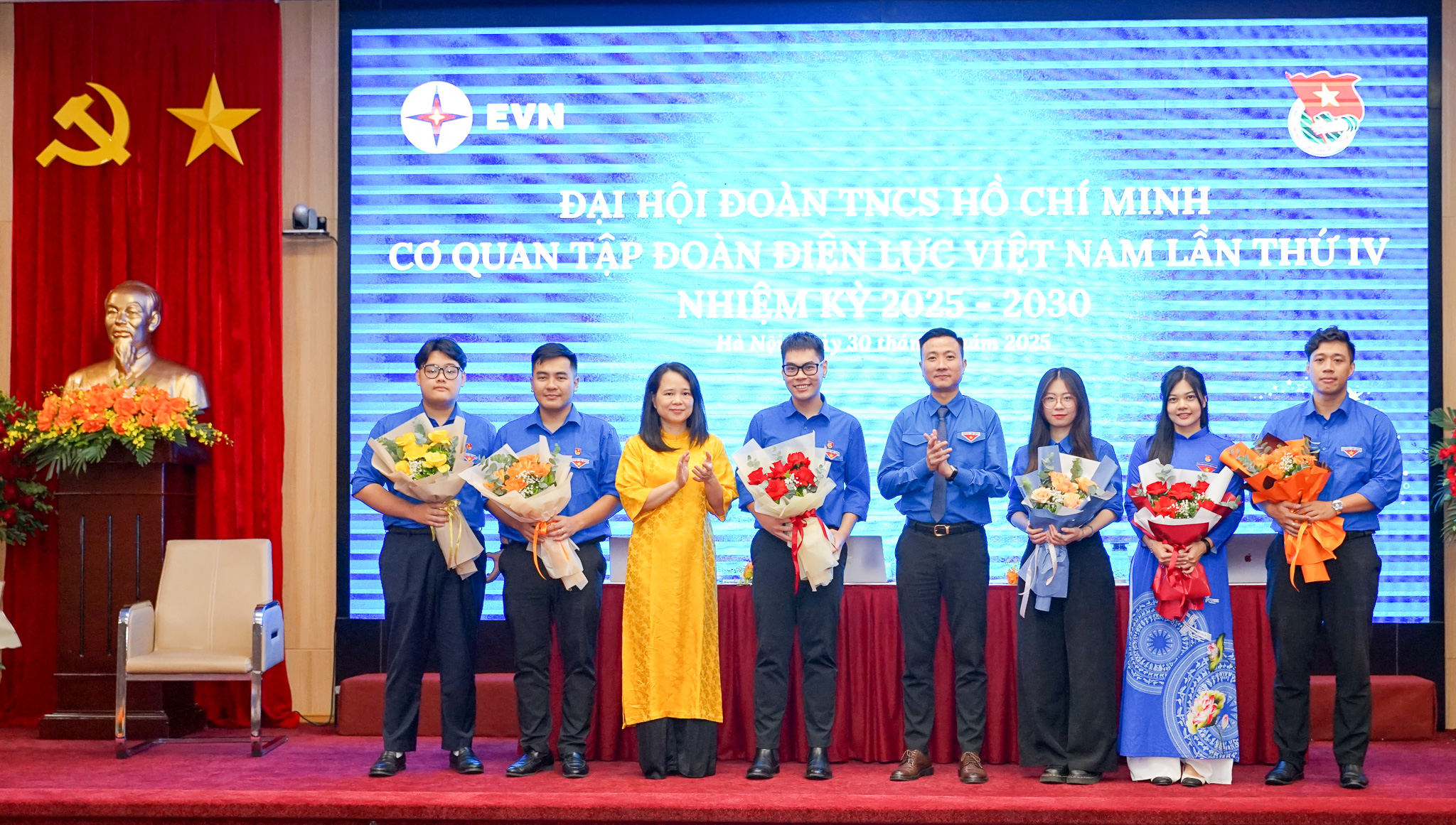 Đồng chí Phạm Thị Thúy Hà - Ủy viên Ban Thường vụ Đảng ủy Trung tâm Điều hành EVN, Trưởng ban Quản lý đấu thầu EVN (thứ 3 từ trái sang) và đồng chí Phạm Xuân Minh Trí – Ủy viên Ban chấp hành Đoàn Thanh niên Chính phủ, Bí thư Đoàn Thanh niên EVN (thứ 4 từ phải sang) trao tặng hoa cho Ban Chấp hành Đoàn Cơ quan EVN khoá mới