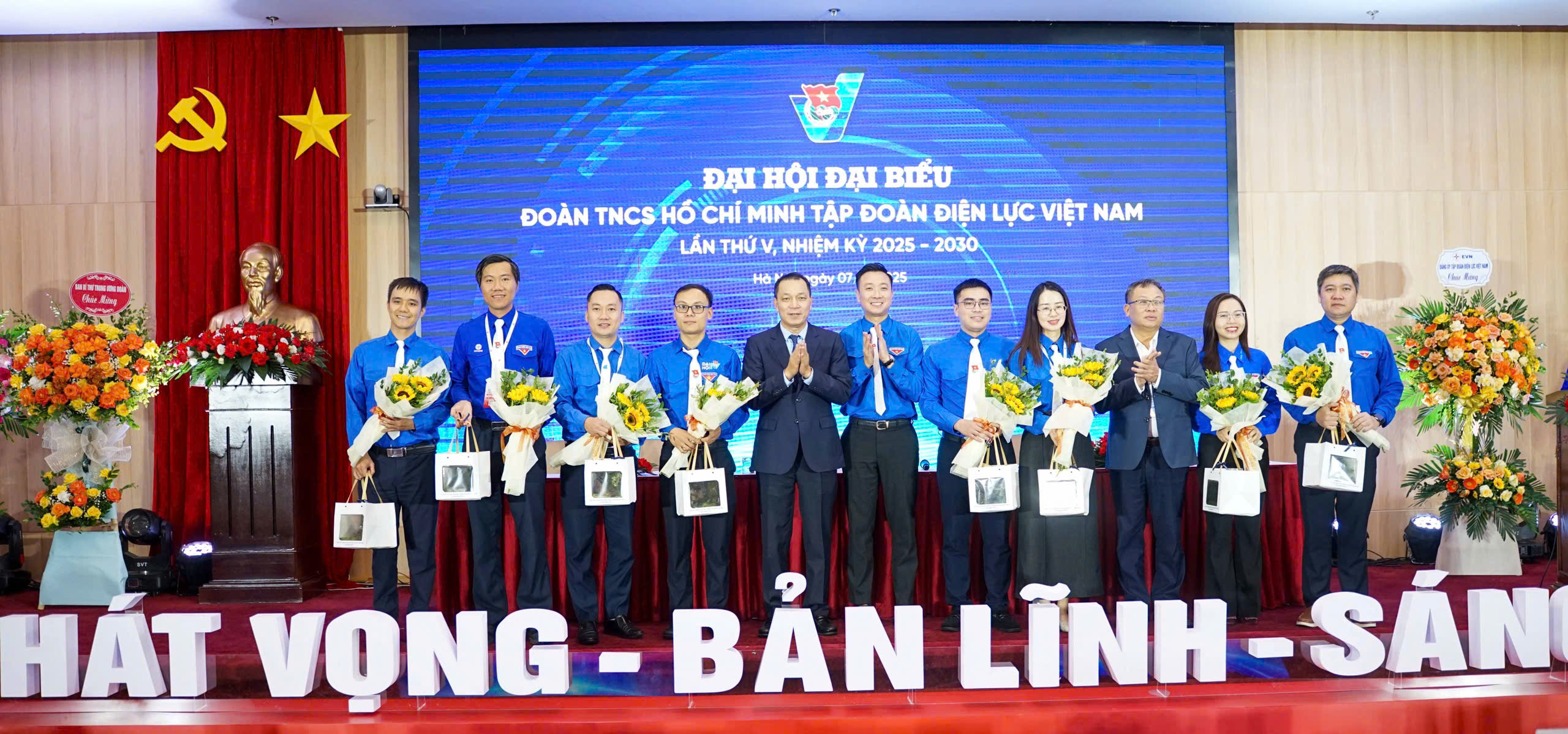 Đồng chí Đặng Hoàng An - Bí thư Đảng uỷ, Chủ tịch HĐTV EVN, đồng chí Phạm Hồng Phương - Phó Tổng giám đốc EVN, đồng chí Phạm Xuân Minh Trí - Bí thư Đoàn Thanh niên EVN tặng hoa các đồng chí Ban chấp hành Đoàn Thanh niên EVN khóa IV, Bí thư các đoàn cơ sở không tái cử