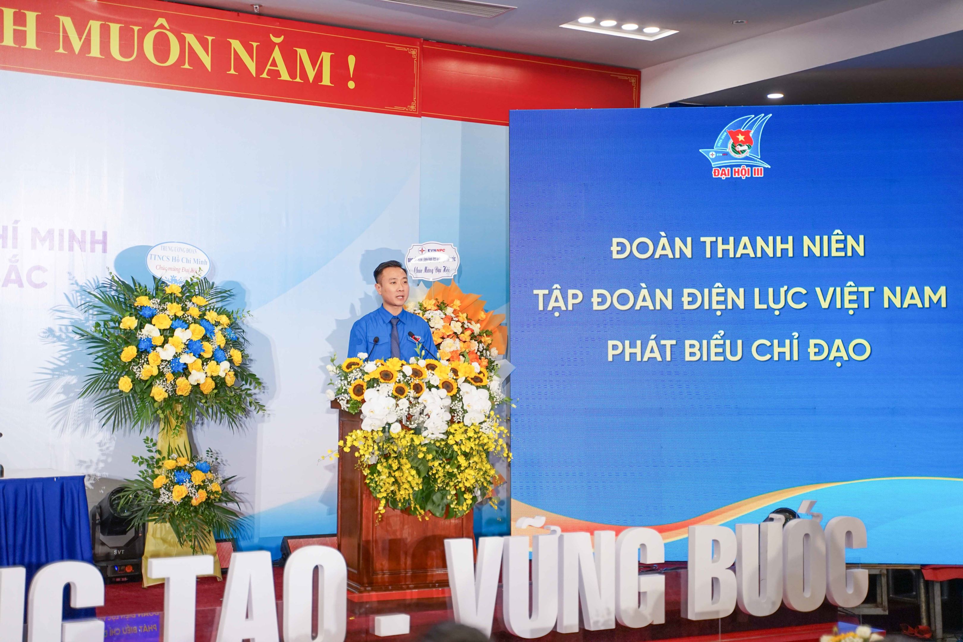 Đồng chí Phạm Xuân Minh Trí – Ủy viên Ban chấp hành Đoàn Thanh niên Chính phủ, Bí thư Đoàn Thanh niên EVN phát biểu tại Đại hội