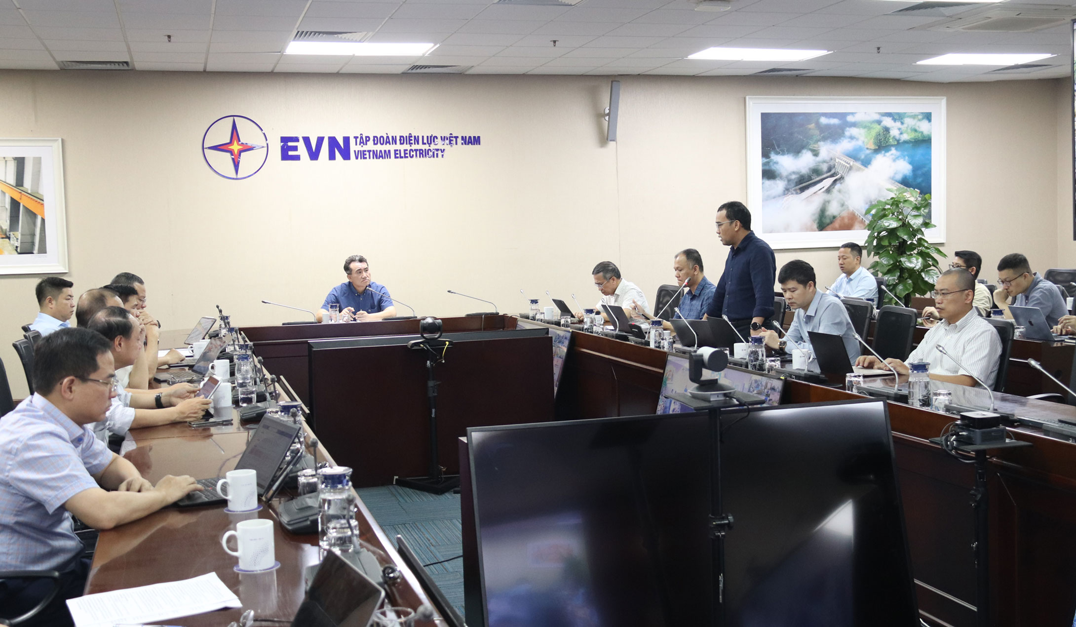 Ông Đặng Huy Cường – Thành viên Hội đồng thành viên EVN chủ trì buổi làm việc. Cùng dự có ông Đinh Thế Phúc - Thành viên Hội đồng thành viên EVN, đại diện các ban chuyên môn EVN, lãnh đạo 9 Tổng công ty trong Tập đoàn, Công ty Mua bán điện (EPTC).