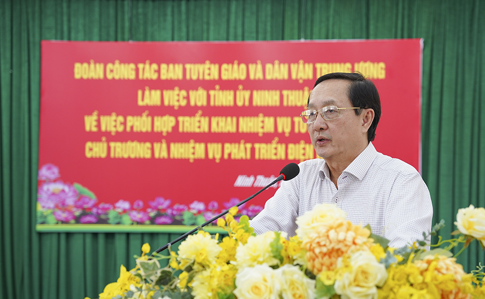 Tại buổi làm việc, đoàn công tác đã nghe lãnh đạo Ban Tuyên giáo và Dân vận tỉnh Ninh Thuận báo cáo tóm tắt công tác triển khai nhiệm vụ tuyên truyền chủ trương phát triển điện hạt nhân tại Việt Nam và dự án điện hạt nhân Ninh Thuận trong thời gian vừa qua. Theo đó, Ban Tuyên giáo và Dân vận tỉnh Ninh Thuận đã xây dựng kế hoạch cụ thể, phân công, bố trí cán bộ, cộng tác viên, tuyên truyền viên phụ trách từng địa bàn nắm bắt mọi diễn biến của dư luận, kịp thời tham mưu cho địa phương đưa ra các giải pháp phù hợp để định hướng dư luận.