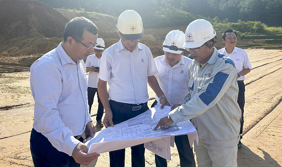 Lãnh đạo EVNNPT nghe báo cáo tiến độ triển khai Dự án Lắp máy biến áp thứ 3 Trạm biến áp 220kV Than Uyên. Ảnh: Lê Linh