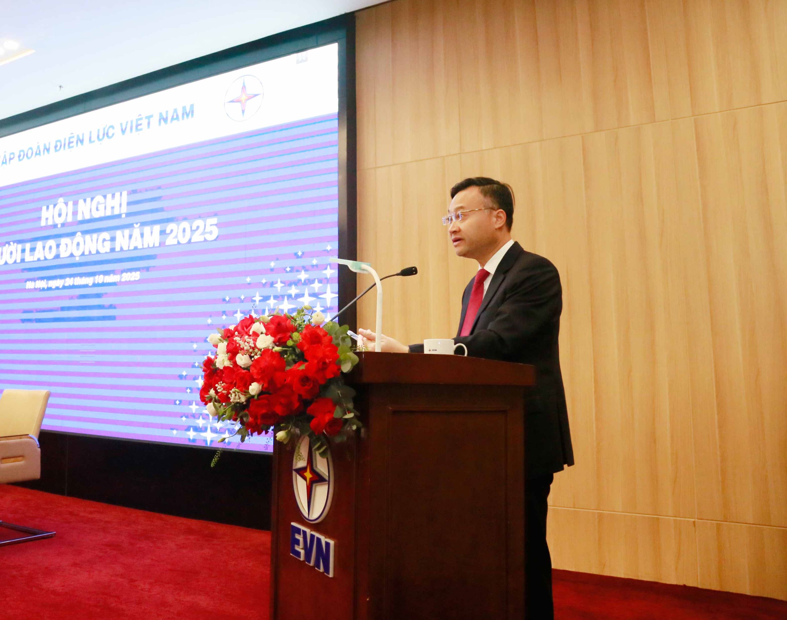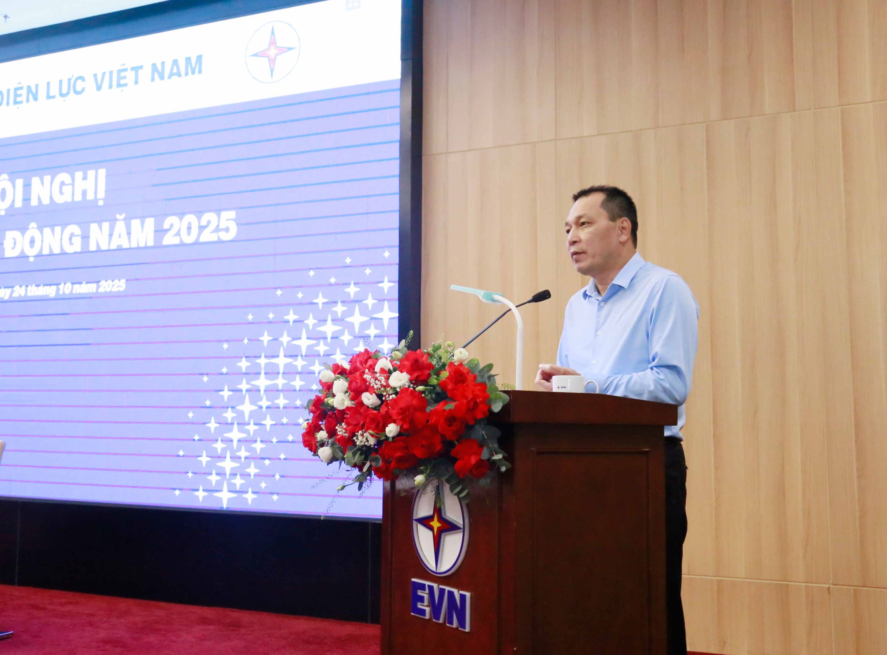 Ông Trần Việt Anh - Trưởng ban Tổ chức Nhân sự EVN trình bày báo cáo về kết quả thực hiện nhiệm vụ của năm 2024 và 9 tháng đầu năm 2025; báo cáo tình hình công tác thi đua khen thưởng, việc giải quyết đơn thư khiếu nại của người lao động năm 2024 và 9 tháng đầu năm 2025