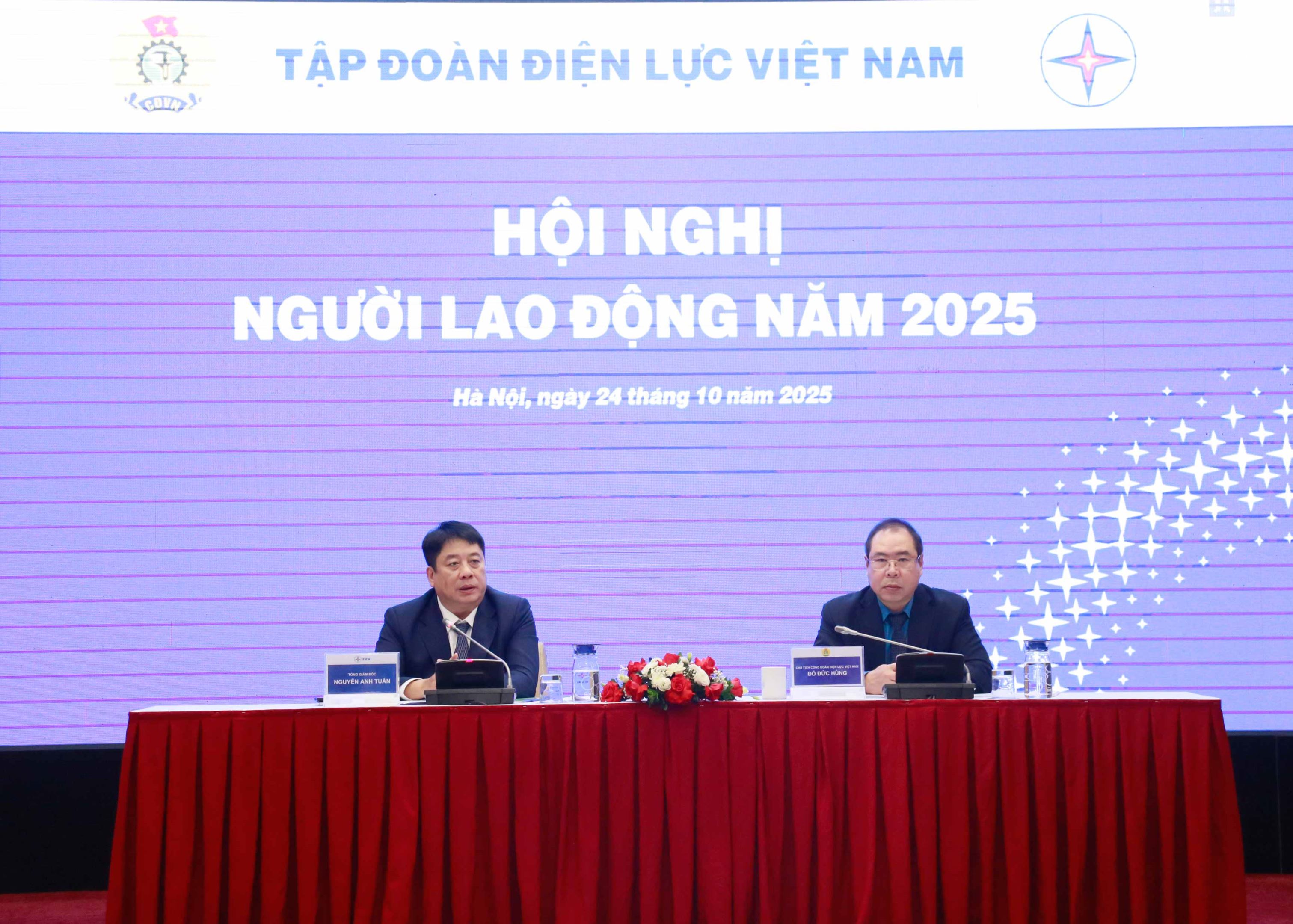 Hội nghị diễn ra dưới sự chủ trì của Tổng giám đốc EVN Nguyễn Anh Tuấn (bên trái) và Chủ tịch Công đoàn ĐLVN Đỗ Đức Hùng (bên phải)