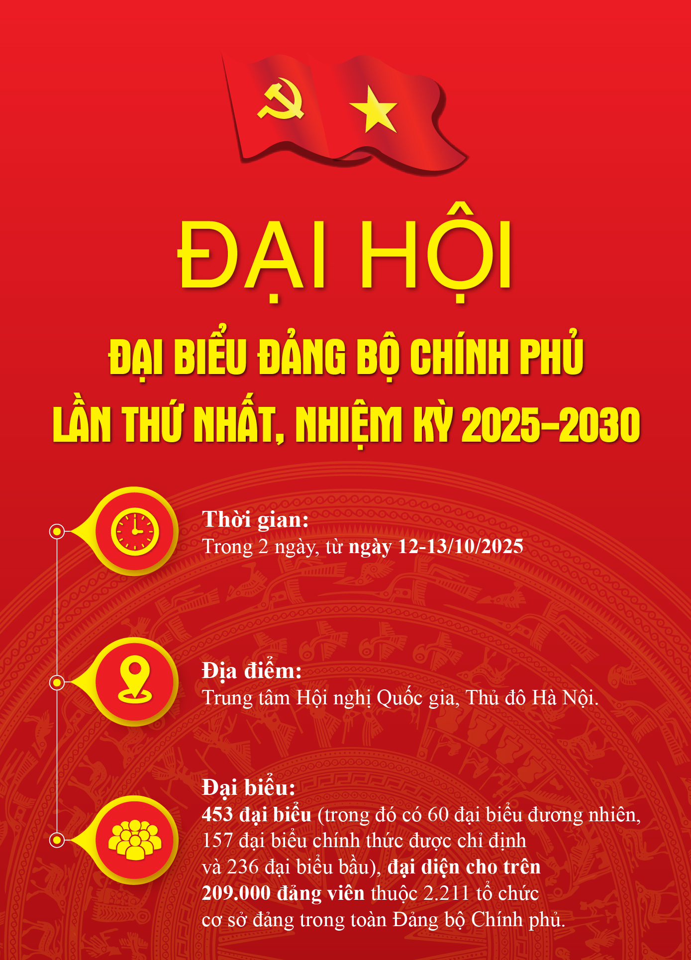 Đại hội đại biểu Đảng bộ Chính phủ lần thứ nhất, nhiệm kỳ 2025-2030 là Đại hội đầu tiên của Đảng bộ Chính phủ theo mô hình tổ chức mới, diễn ra trong bối cảnh toàn Đảng, toàn dân, toàn quân ta đang nỗ lực phấn đấu, quyết tâm hoàn thành thắng lợi các mục tiêu phát triển KTXH năm 2025 và 5 năm 2021-2025; thi đua lập thành tích chào mừng Đại hội Đại biểu toàn quốc lần thứ XIV của Đảng.