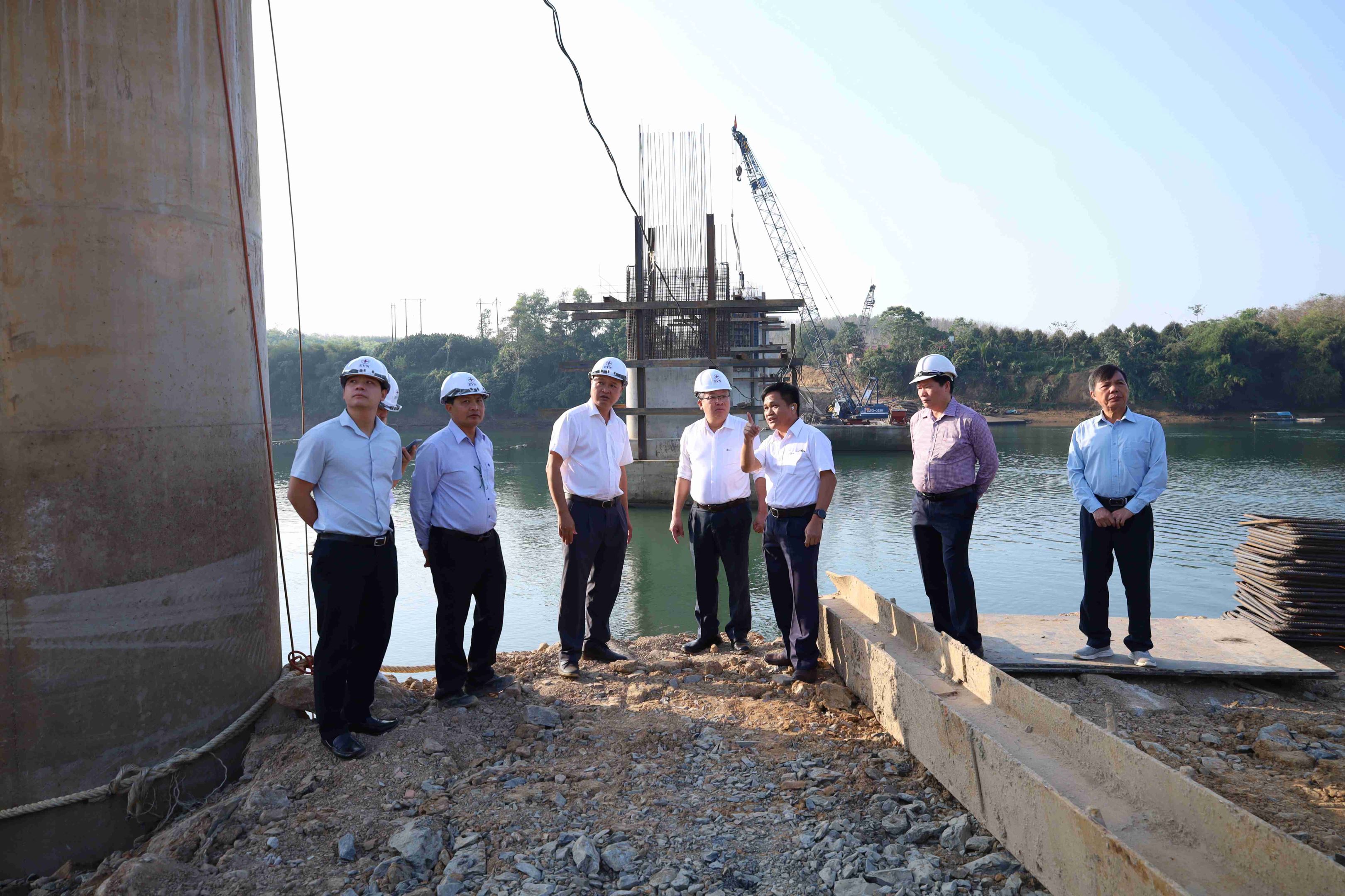 Dự án Nhà máy Thủy điện Trị An mở rộng có vốn đầu tư hơn 3.900 tỷ đồng, gồm 2 tổ máy với tổng công suất lắp đặt 200MW, dự kiến hoàn thành và phát điện vào cuối năm 2027. Trong ảnh: Phó Tổng giám đốc EVN Phạm Hồng Phương (thứ tư, từ trái qua) và đoàn công tác kiểm tra tiến độ thi công cầu Hiếu Liêm (xã Trị An, Đồng Nai).