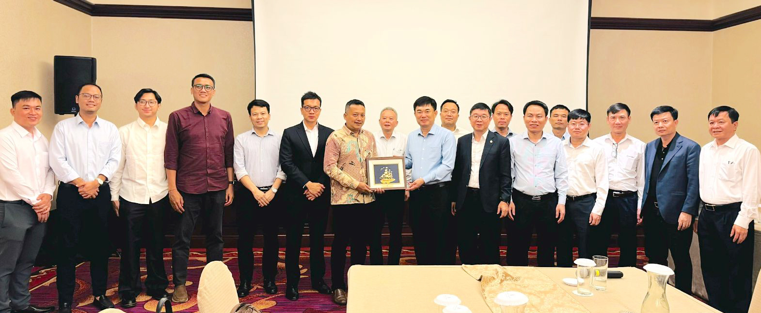 Phó Tổng giám đốc EVN Phạm Lê Phú (hàng đầu, thứ sáu từ trái sang) chụp ảnh lưu niệm với các thành viên đoàn công tác và đối tác Indonesia