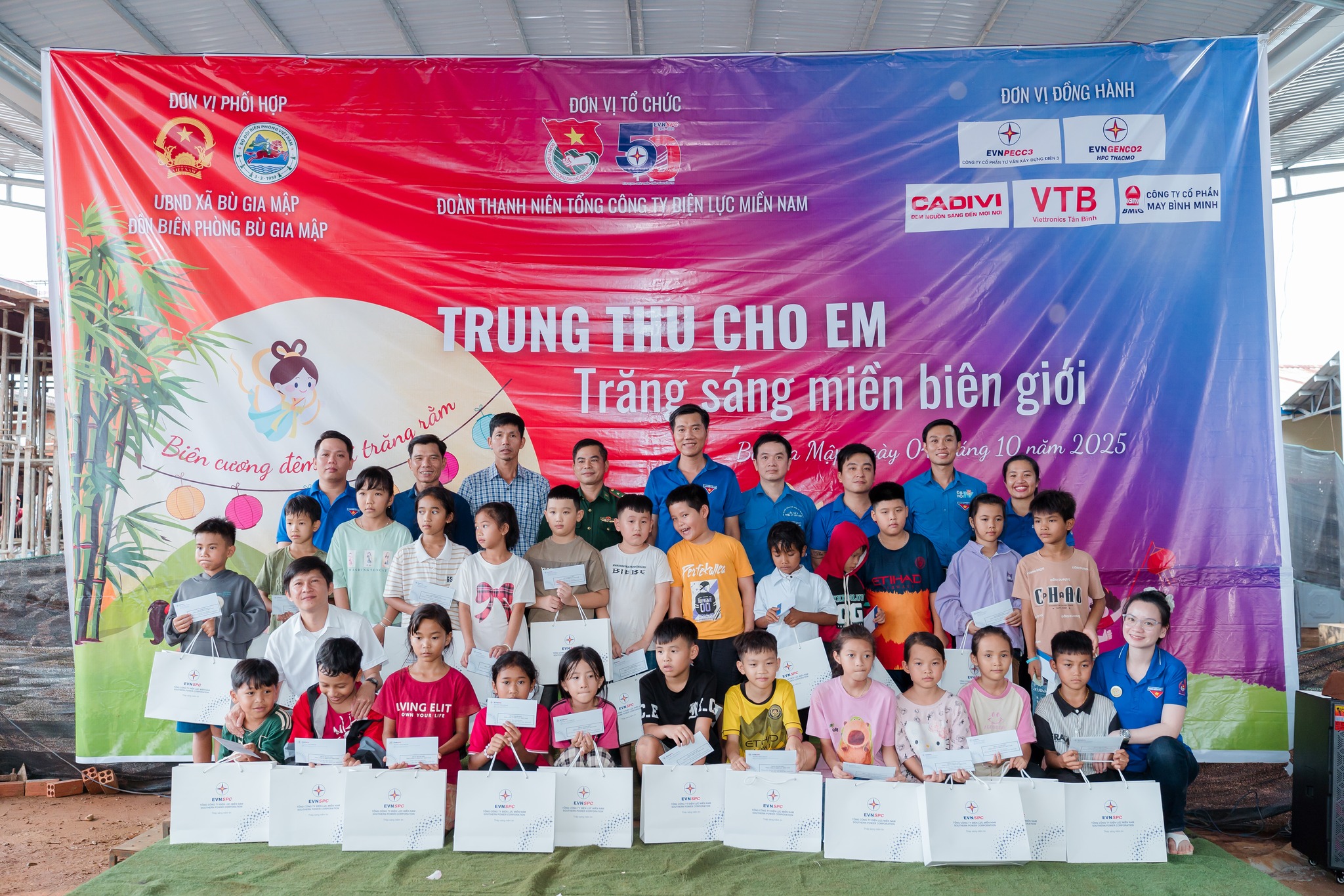 Hoạt động chăm lo, tặng quà cho trẻ em nhân dịp Trung thu được nhiều đơn vị trong EVN tổ chức thường niên. Trong ảnh: Qua 10 năm tổ chức chương trình “Trung thu cho em”, Đoàn Thanh niên Tổng công ty Điện lực miền Nam và các đơn vị đã mang tới niềm vui cho gần 1.000 trẻ em xã biên giới Bù Gia Mập, tỉnh Đồng Nai.