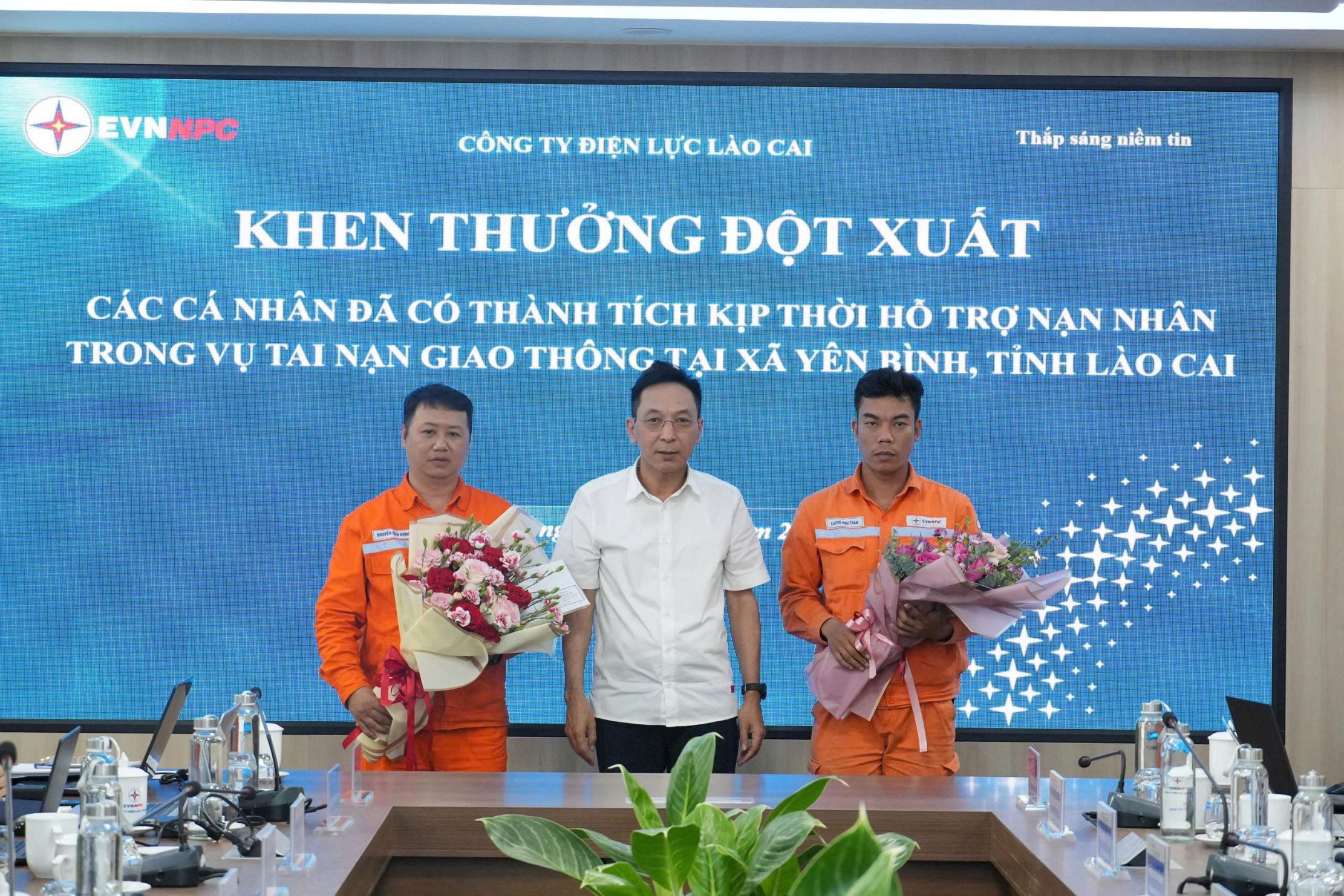 Giám đốc Công ty Điện lực Lào Cai Nguyễn Anh Tuấn (sơ mi trắng) trao thưởng đột xuất cho 2 nhân viên của Điện lực Yên Bái vì đã kịp thời hỗ trợ nạn nhân trong vụ tai nạn giao thông tại xã Yên Bình, tỉnh Lào Cai