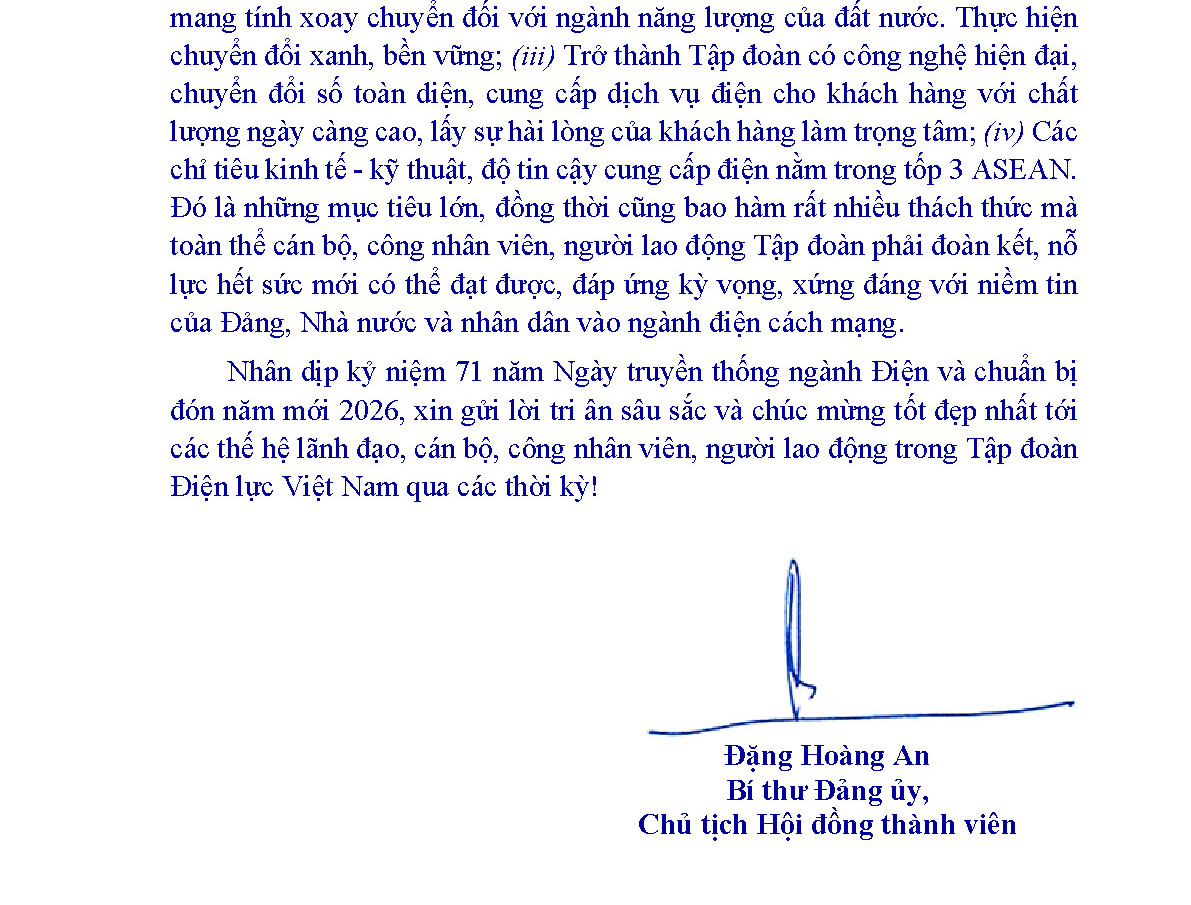 Nhân dịp kỷ niệm 71 năm Ngày truyền thống ngành Điện lực Việt Nam (21/12/1954 - 21/12/2025), đồng chí Đặng Hoàng An - Bí thư Đảng ủy, Chủ tịch HĐTV EVN gửi lời tri ân sâu sắc và chúc mừng tốt đẹp nhất tới các thế hệ lãnh đạo, cán bộ, công nhân viên, người lao động trong Tập đoàn Điện lực Việt Nam qua các thời kỳ!