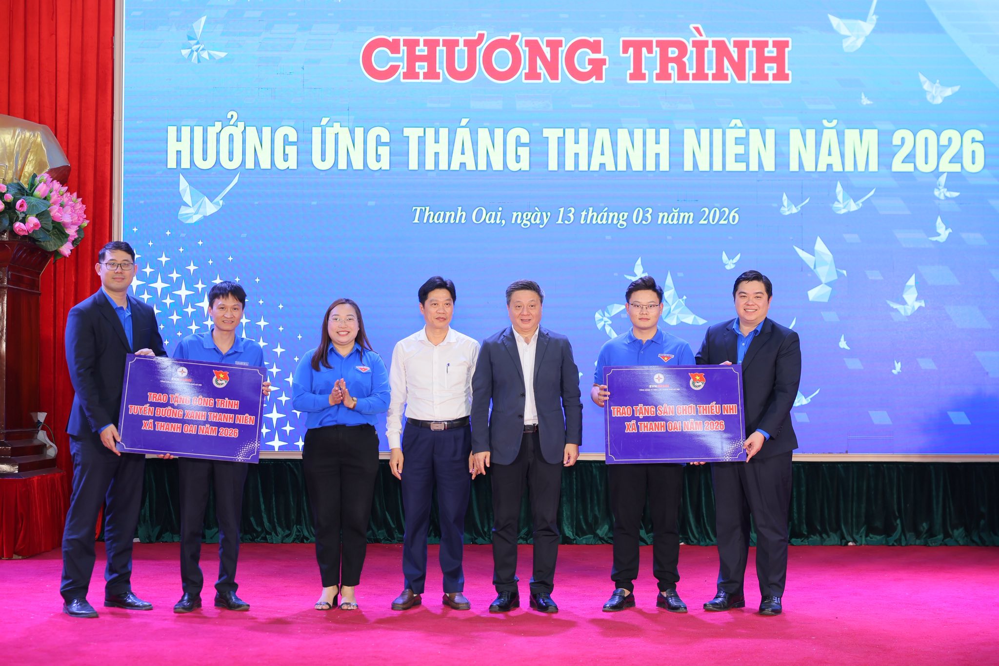 Đoàn Thanh niên Tổng công ty Điện lực TP Hà Nội (EVNHANOI) trao tặng công trình Sân chơi thiếu nhi và Tuyến đường xanh Thanh niên cho UBND xã Thanh Oai, TP Hà Nội.