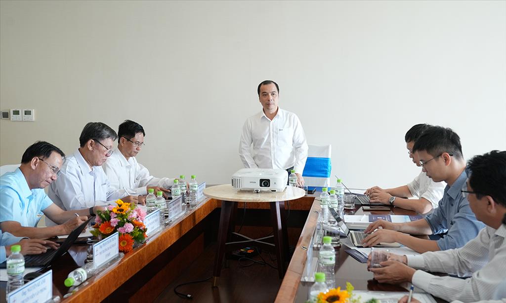 Ông Nguyễn Đức Cường - Thành viên HĐTV EVN (đầu tiên bên phải) và ông Nguyễn Tài Anh - Phó Tổng giám đốc EVN (chủ trì cuộc họp) làm việc với Ban Quản lý dự án Điện 2