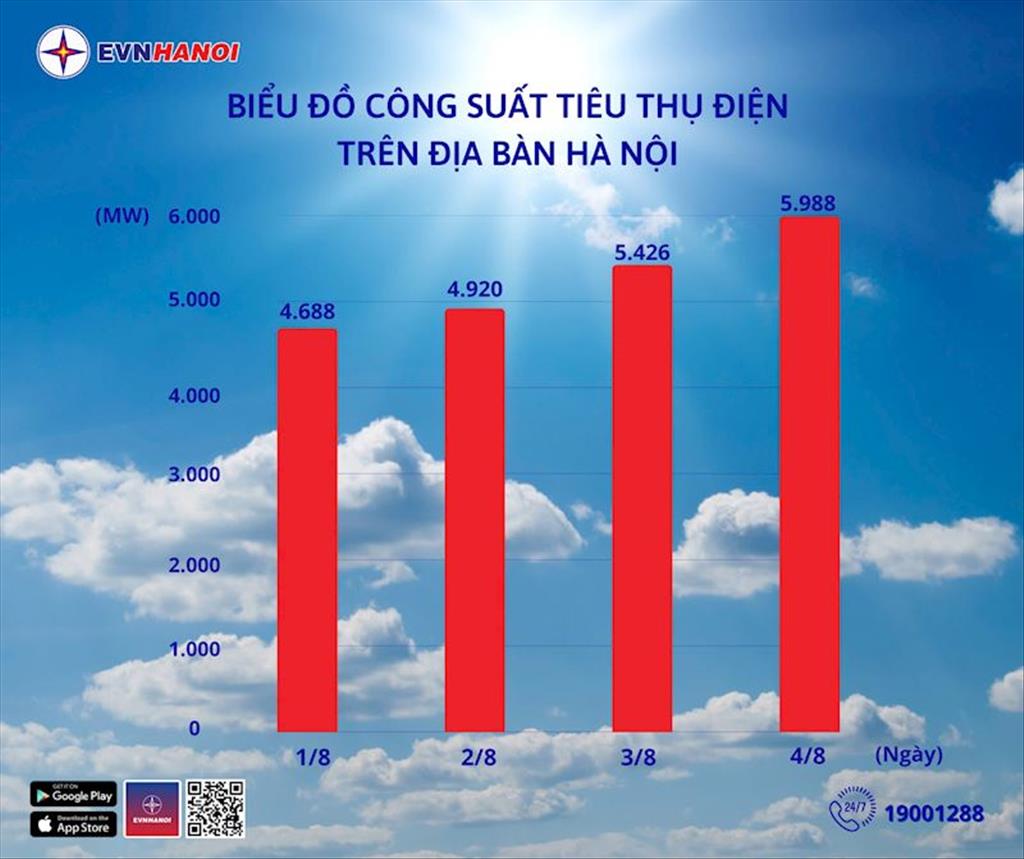Tổng công ty Điện lực TP Hà Nội (EVNHANOI) ghi nhận công suất tiêu thụ điện trên toàn thành phố lên tới 5.988MW vào lúc 13h20 ngày 4/8 - cao nhất từ trước đến nay.