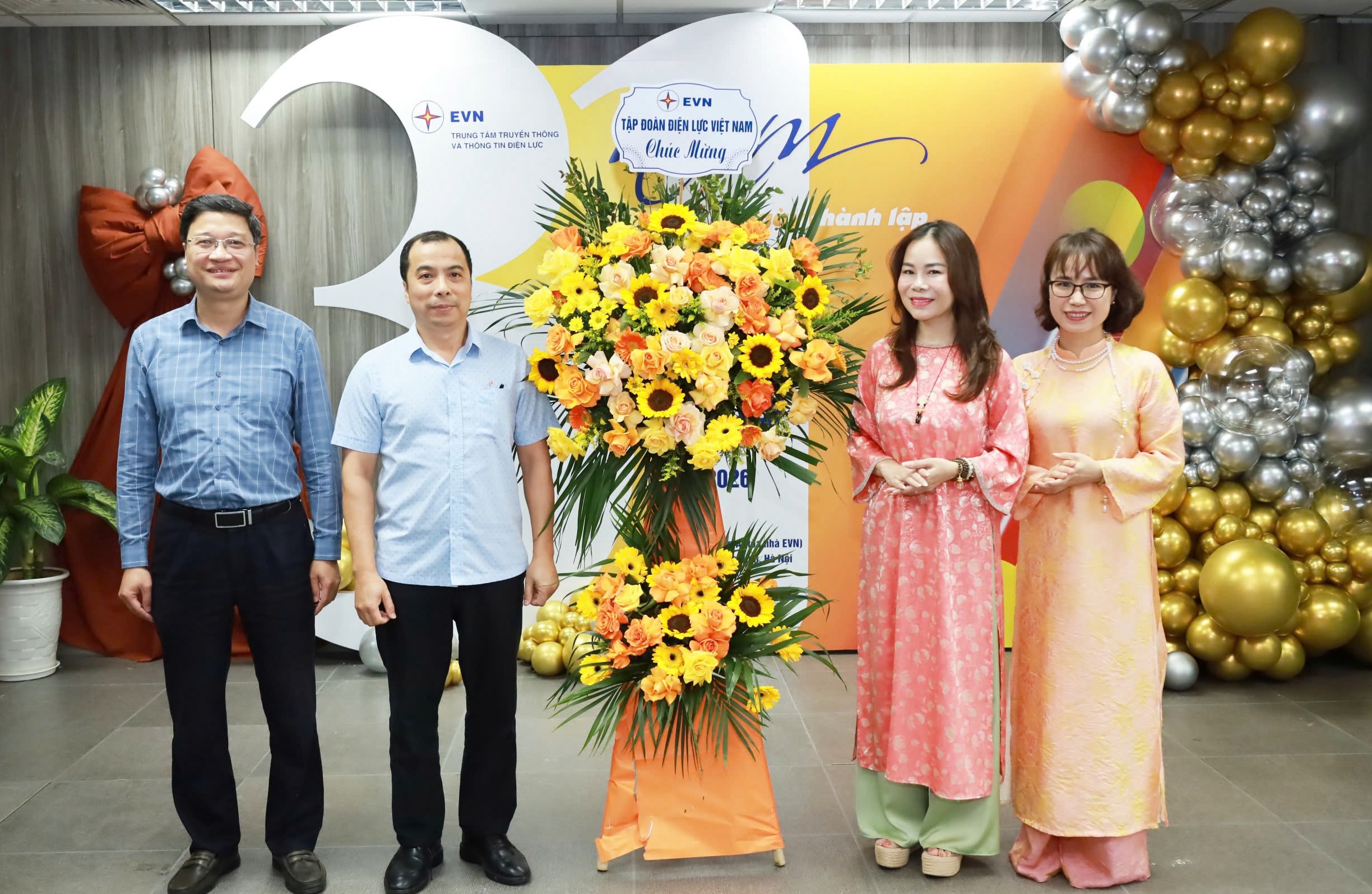 Phó Tổng giám đốc EVN Ngô Sơn Hải (thứ hai, từ phải sang), Trưởng ban Truyền thông và Văn hoá doanh nghiệp EVN Trịnh Mai Phương (đầu tiên bên trái) tặng hoa chúc mừng EVNEIC. Ảnh: Vũ Gia Hiếu