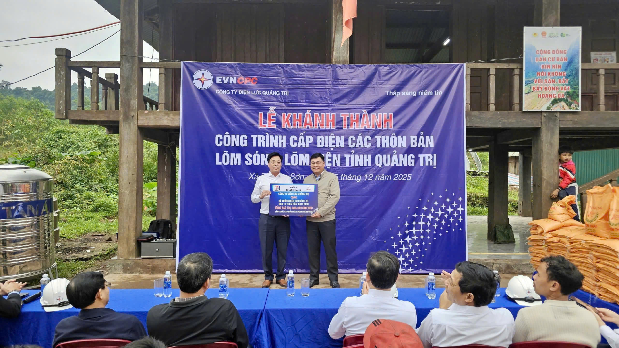 Dịp này, Công ty Điện lực Quảng Trị còn trích Quỹ phúc lợi hơn 650 triệu đồng để hỗ trợ người dân lắp đặt hệ thống điện sau công tơ, bao gồm dây dẫn điện, bóng đèn và bảng điện trong từng hộ gia đình. Bên cạnh đó, Công ty tặng suất quà trị giá 500.000 đồng cho mỗi hộ dân bản Rìn Rìn, xã Trường Sơn. Những phần quà mang ý nghĩa thiết thực, thể hiện sự quan tâm, sẻ chia và trách nhiệm xã hội của ngành Điện đối với bà con vùng biên giới, góp phần động viên người dân yên tâm sinh sống, lao động sản xuất và từng bước ổn định cuộc sống khi điện lưới quốc gia đã được đưa về bản.