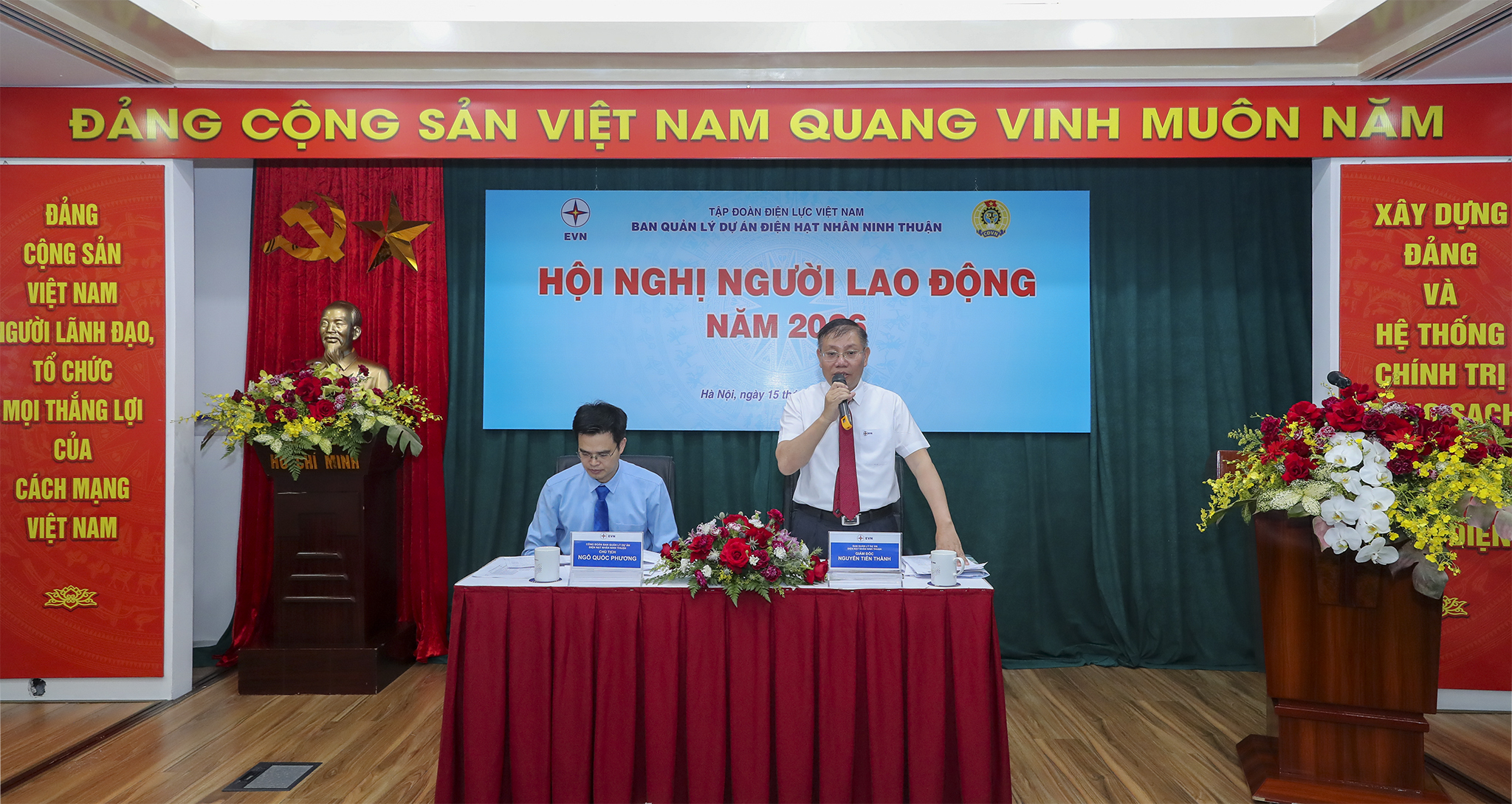 Giám đốc và Chủ tịch Công đoàn EVNNPB đồng chủ trì, điều hành Hội nghị người lao động năm 2026. Ảnh: Ng.Tuấn