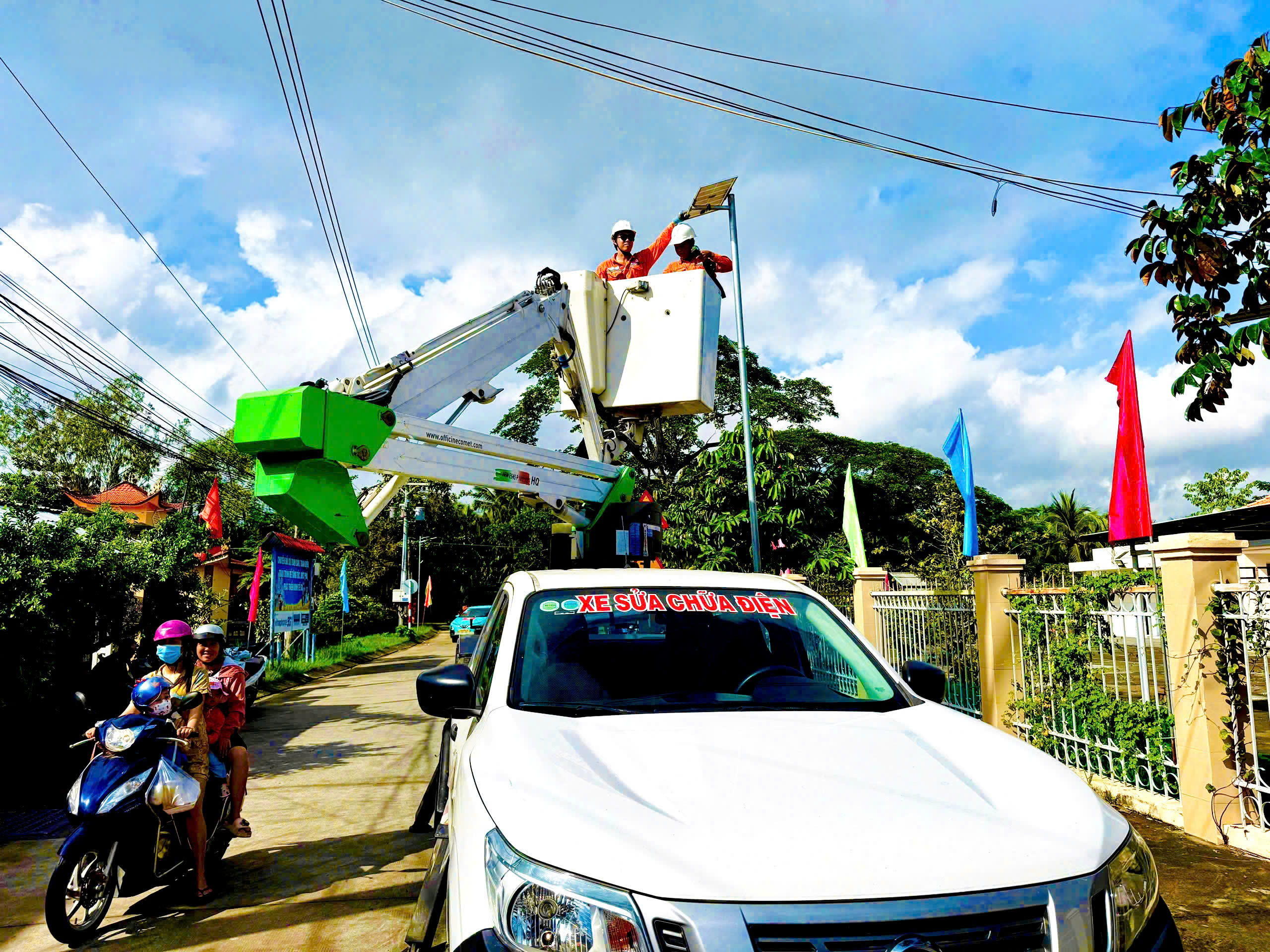 Công nhân điện lắp đặt công trình “Thắp sáng tuyến đường giao thông và đường cờ Tổ quốc” tại phường Bến Tre. Ảnh: PC Vĩnh Long