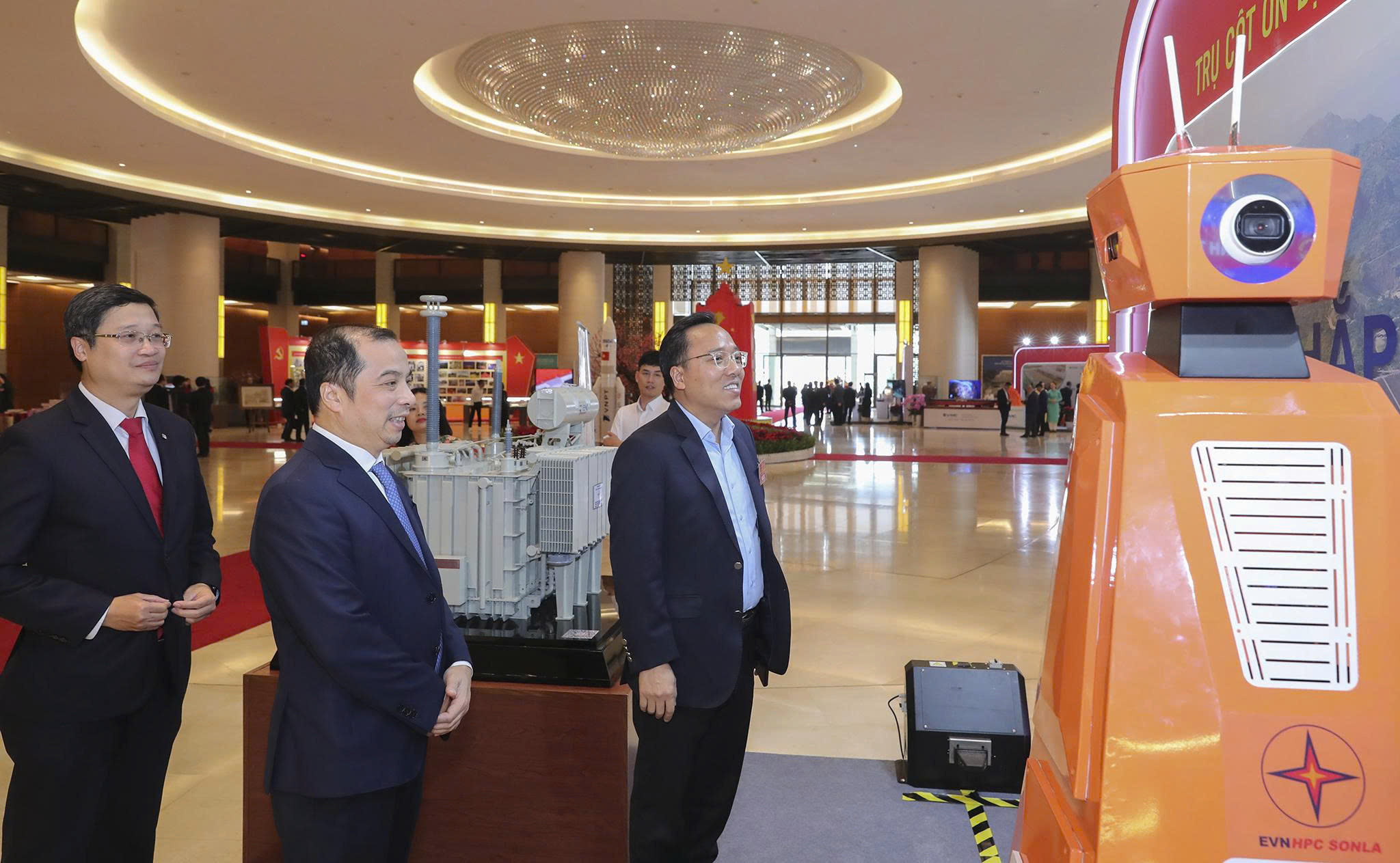 Các đồng chí lãnh đạo, nguyên lãnh đạo Đảng, Nhà nước thăm quan khu vực trưng bày của EVN tại Triển lãm bên lề Hội nghị toàn quốc nghiên cứu, học tập, quán triệt và triển khai thực hiện Nghị quyết Đại hội XIV của Đảng
