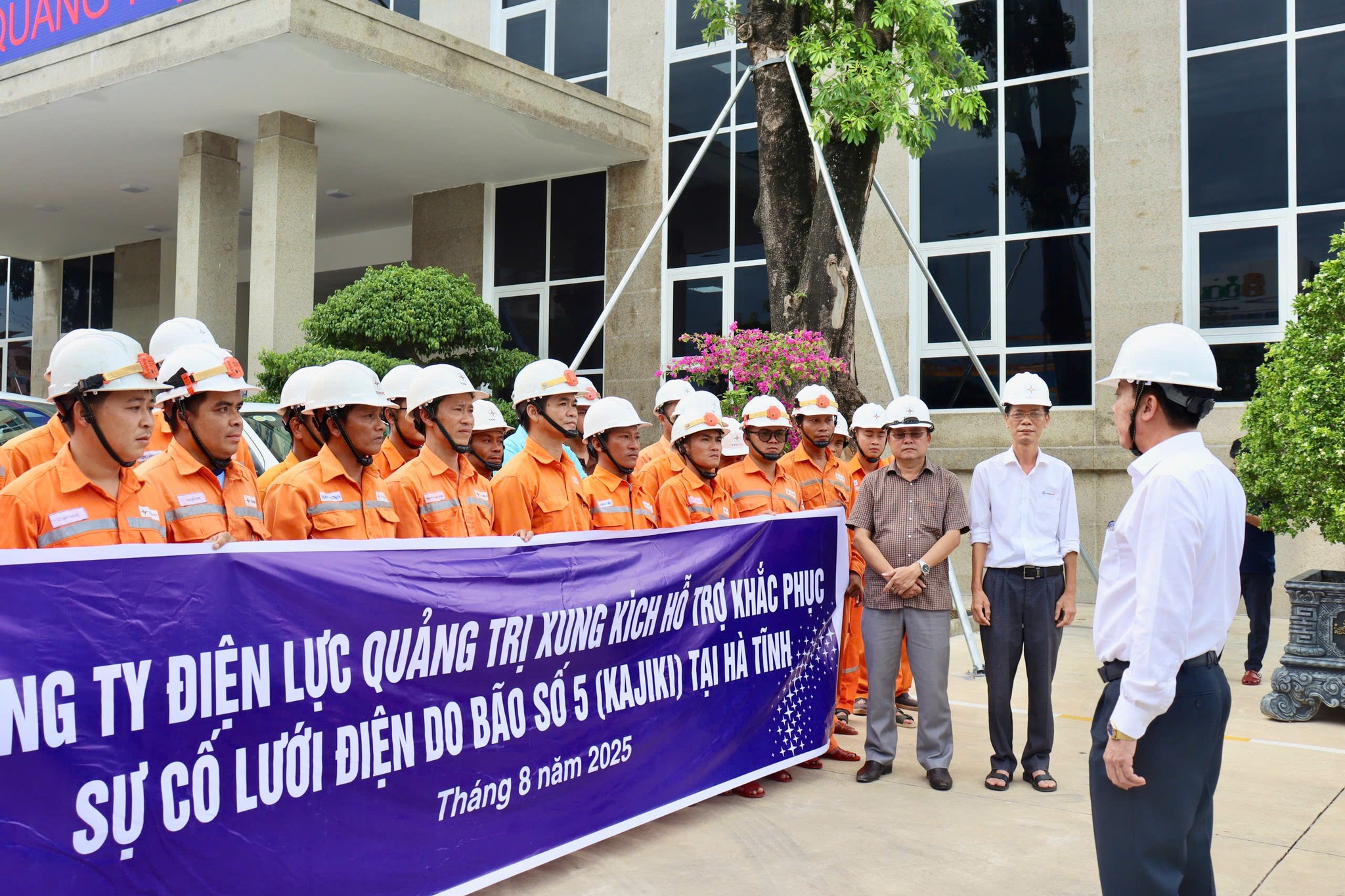 Bão số 5 gây thiệt hại nặng nề lưới điện trung – hạ áp tại các tỉnh miền Trung và Bắc Trung Bộ, đặc biệt ở Hà Tĩnh, Nghệ An, làm gián đoạn cấp điện trên diện rộng. Ngay sau khi bão tan, các đội xung kích trong Tổng công ty Điện lực miền Bắc và Tổng công ty Điện lực miền Trung đã được gấp rút điều động tới 2 địa phương. Trong ảnh: Đoàn công tác PC Quảng Trị trước giờ lên đường chi viện tỉnh Hà Tĩnh, ngày 26/8