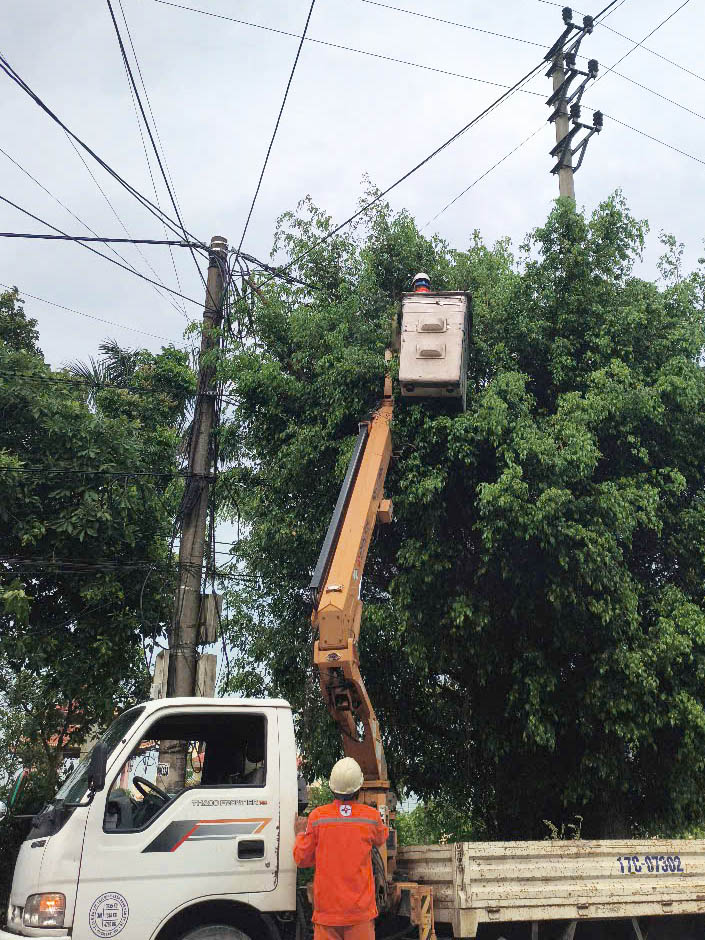 Công ty Điện lực Hưng Yên tổ chức phát quang hành lang an toàn lưới điện trung – hạ thế, ảnh chụp lúc 17h chiều 21/7/2025. Ảnh: Vũ Huế
