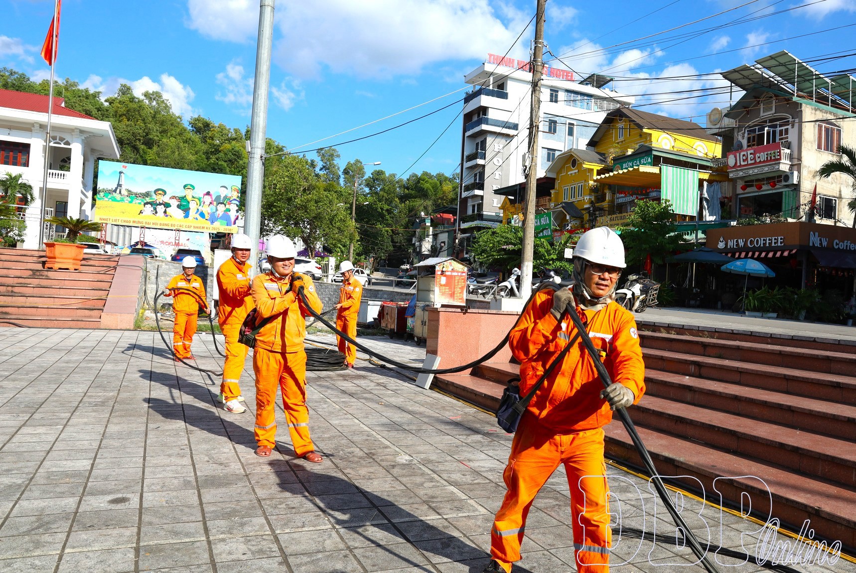 Công nhân ngành Điện chuẩn bị đường dây cung cấp điện cho các hoạt động tại Quảng trường 7/5