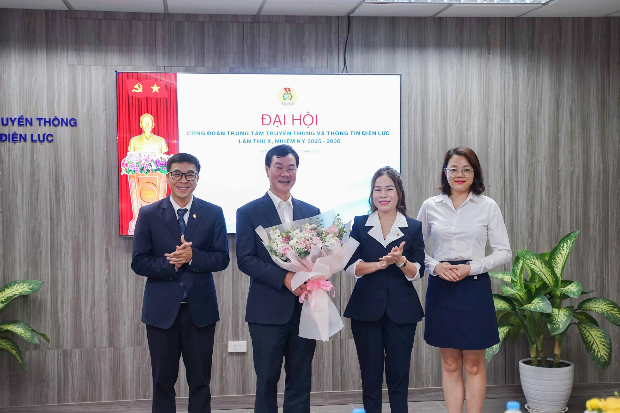 Đồng chí Nguyễn Kim Thanh - Phó Chủ tịch Công đoàn Điện lực Việt Nam và đồng chí Đinh Thị Bảo Ngọc - Bí thư Chi bộ, Giám đốc EVNEIC tặng hoa chúc mừng Ban chấp hành Công đoàn Trung tâm Truyền thông và Thông tin Điện lực khóa X, nhiệm kỳ 2025 - 2030