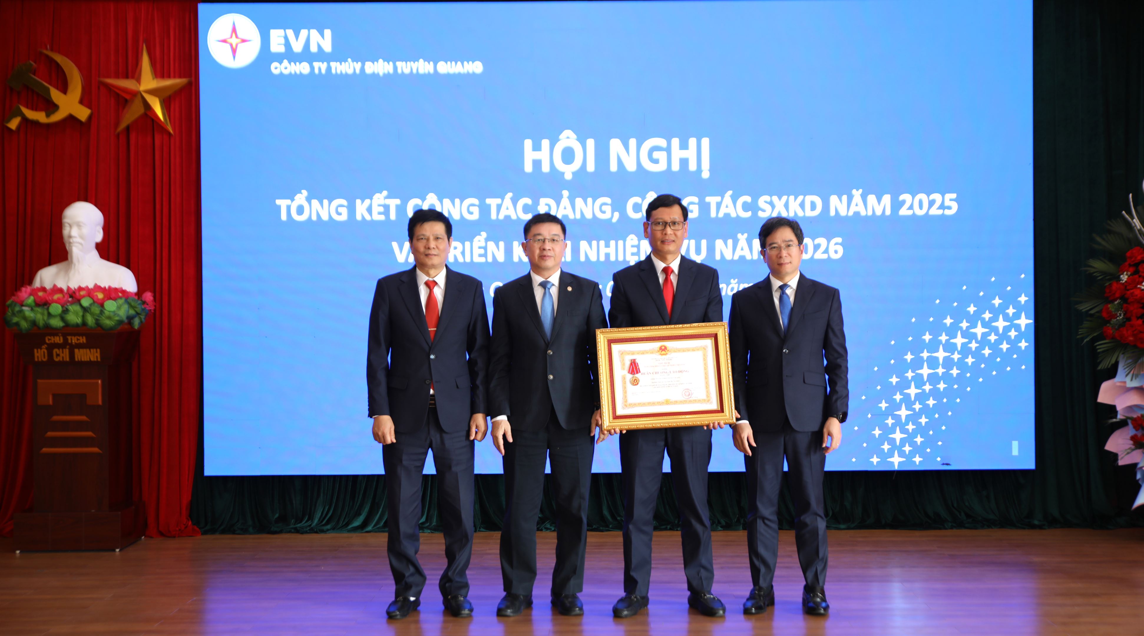 Năm 2025, Công ty Thủy điện Tuyên Quang vinh dự được đón nhận Huân chương Lao động hạng Nhì, là sự ghi nhận của Đảng, Nhà nước với những đóng góp và thành tích xuất sắc trong công tác, góp phần vào sự nghiệp xây dựng chủ nghĩa xã hội và bảo vệ Tổ quốc. Trong ảnh: Phó Tổng giám đốc EVN Phạm Lê Phú chúc mừng Công ty Thủy điện Tuyên Quang được Chủ tịch nước tặng thưởng Huân chương Lao động Hạng Nhì.