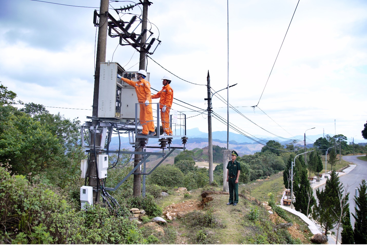 Cán bộ, công nhân viên EVNNPC phối hợp với lực lượng Bộ đội Biên phòng kiểm tra lưới điện, đảm bảo cung cấp điện an toàn, liên tục tại các địa bàn miền núi, biên giới