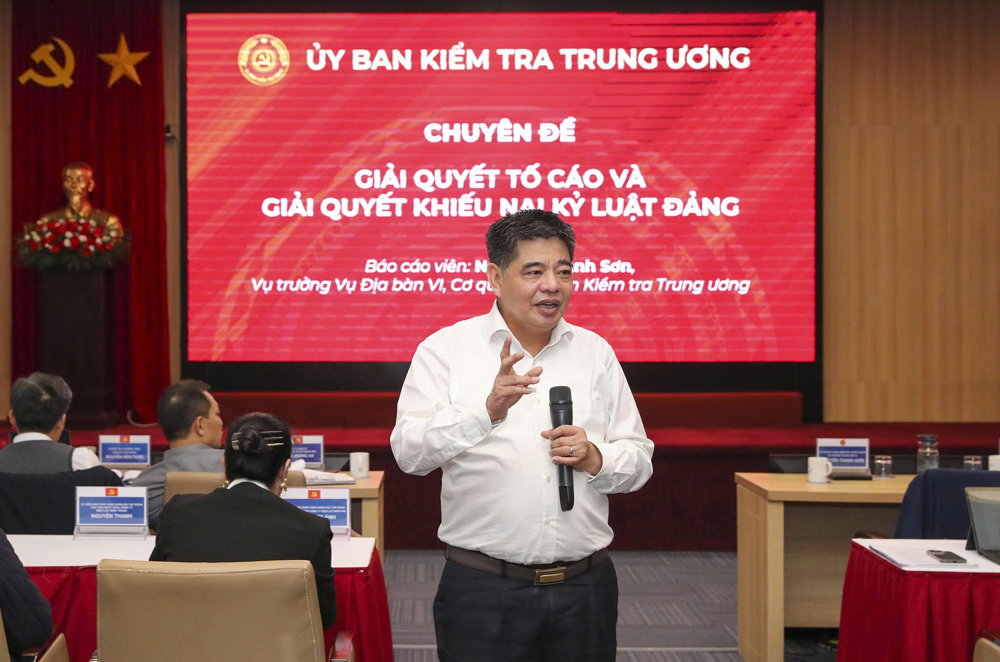 Buổi chiều, các đại biểu tiếp tục nghiên cứu chuyên đề “Tăng cường lãnh đạo, chỉ đạo, xử lý giải quyết đơn thư tố cáo và giải quyết khiếu nại kỷ luật Đảng; thi hành kỷ luật Đảng; công tác kiểm soát tài sản, thu nhập” do đồng chí Nguyễn Thanh Sơn – Vụ trưởng Vụ Địa bàn VI trình bày.