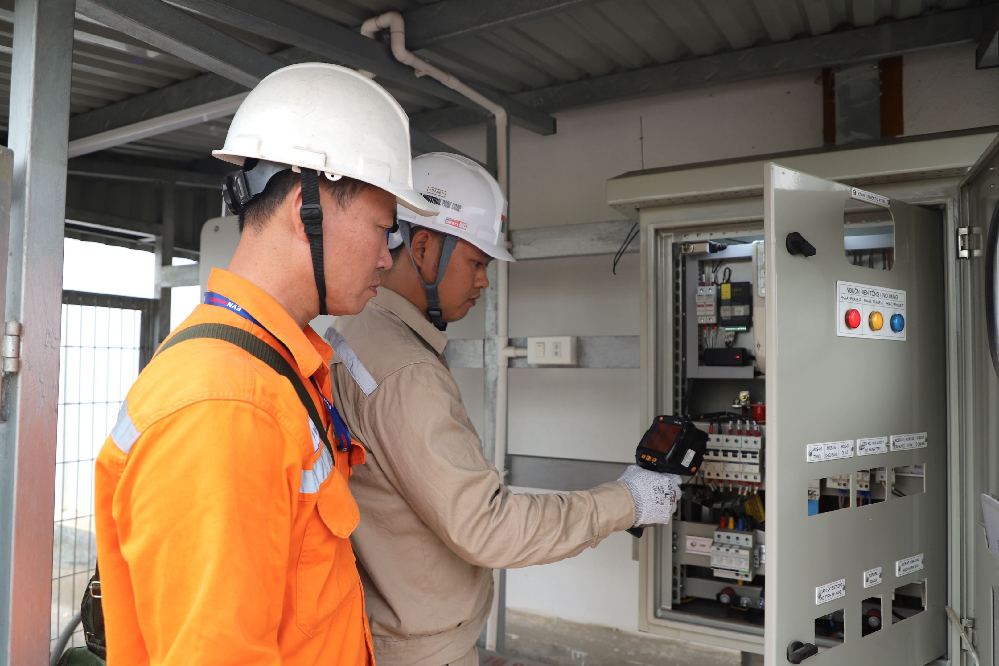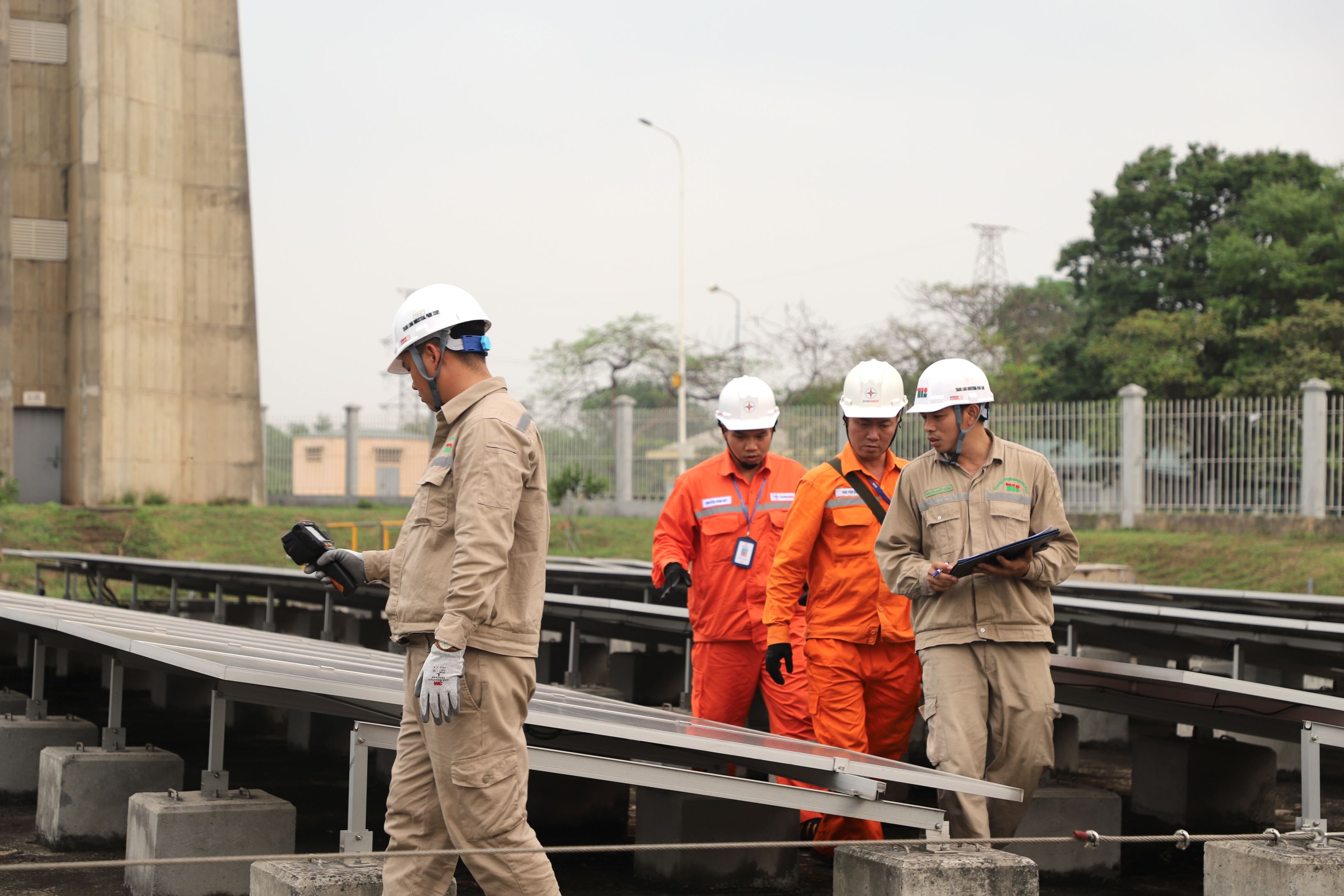 Nhân viên Công ty Điện lực Đông Anh và đội kĩ thuật KCN Thăng Long phối hợp kiểm tra khu vực lắp đặt ĐMTMN