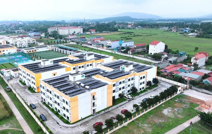 Công ty TNHH Điện Nghi Sơn 2 (Khu Kinh tế Nghi Sơn) lắp đặt hệ thống điện mặt trời mái nhà tích hợp hệ thống pin lưu trữ năng lượng tại cư xá của người lao động. Ảnh: Báo Thanh Hóa