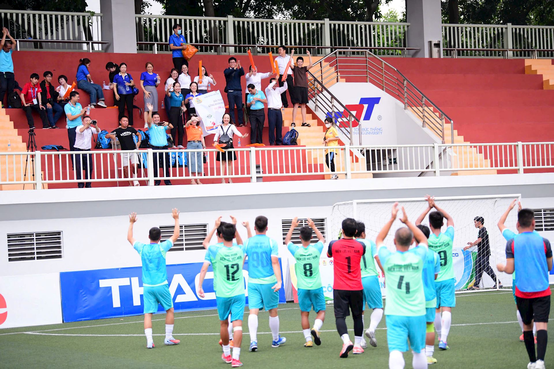 Các cầu thủ Công đoàn Điện lực Việt Nam tri ân hội cổ động viên sau chiến thắng kịch tính trước Công đoàn Gia Lai