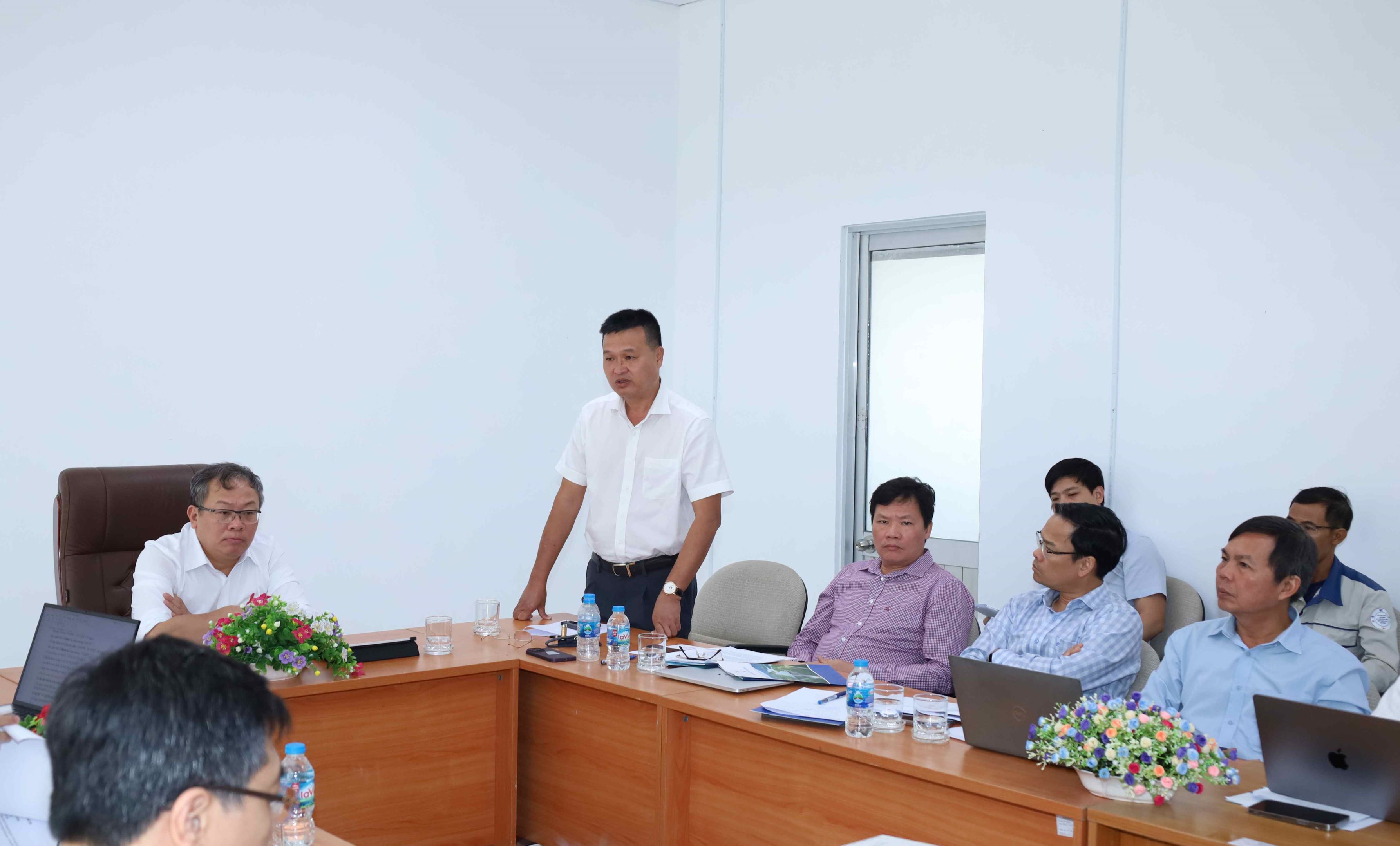 Giám đốc EVNPMB3 Phạm Thanh Hoài (đứng) báo cáo đoàn công tác