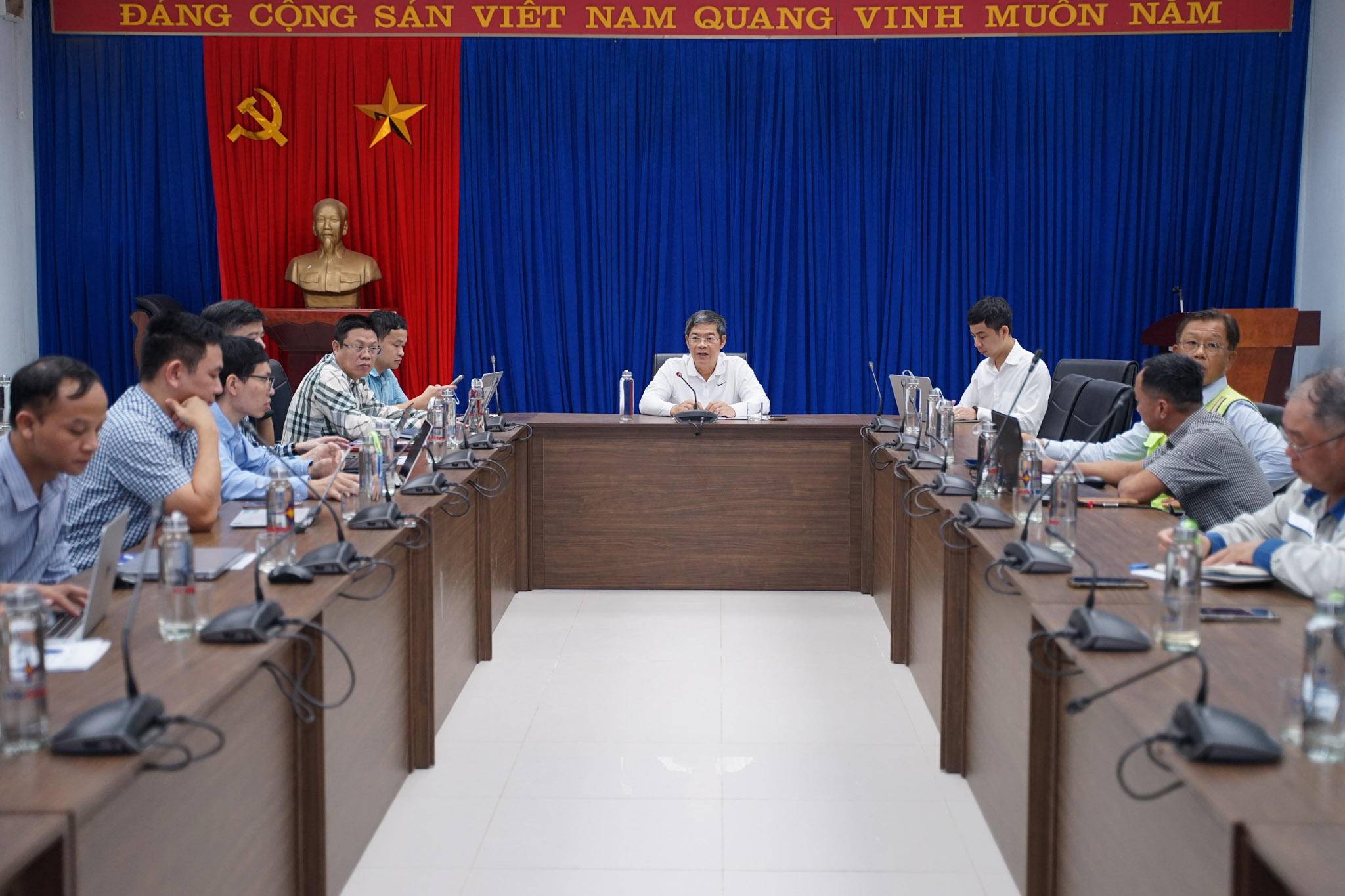 Phó Tổng giám đốc EVN Nguyễn Tài Anh cùng đoàn công tác của EVN họp với EVNPMB2 và các nhà thầu sau khi đi kiểm tra công trường. Dự án NMNĐ Quảng Trạch 1 dự kiến sẽ phát điện thương mại các tổ máy trong năm 2026.