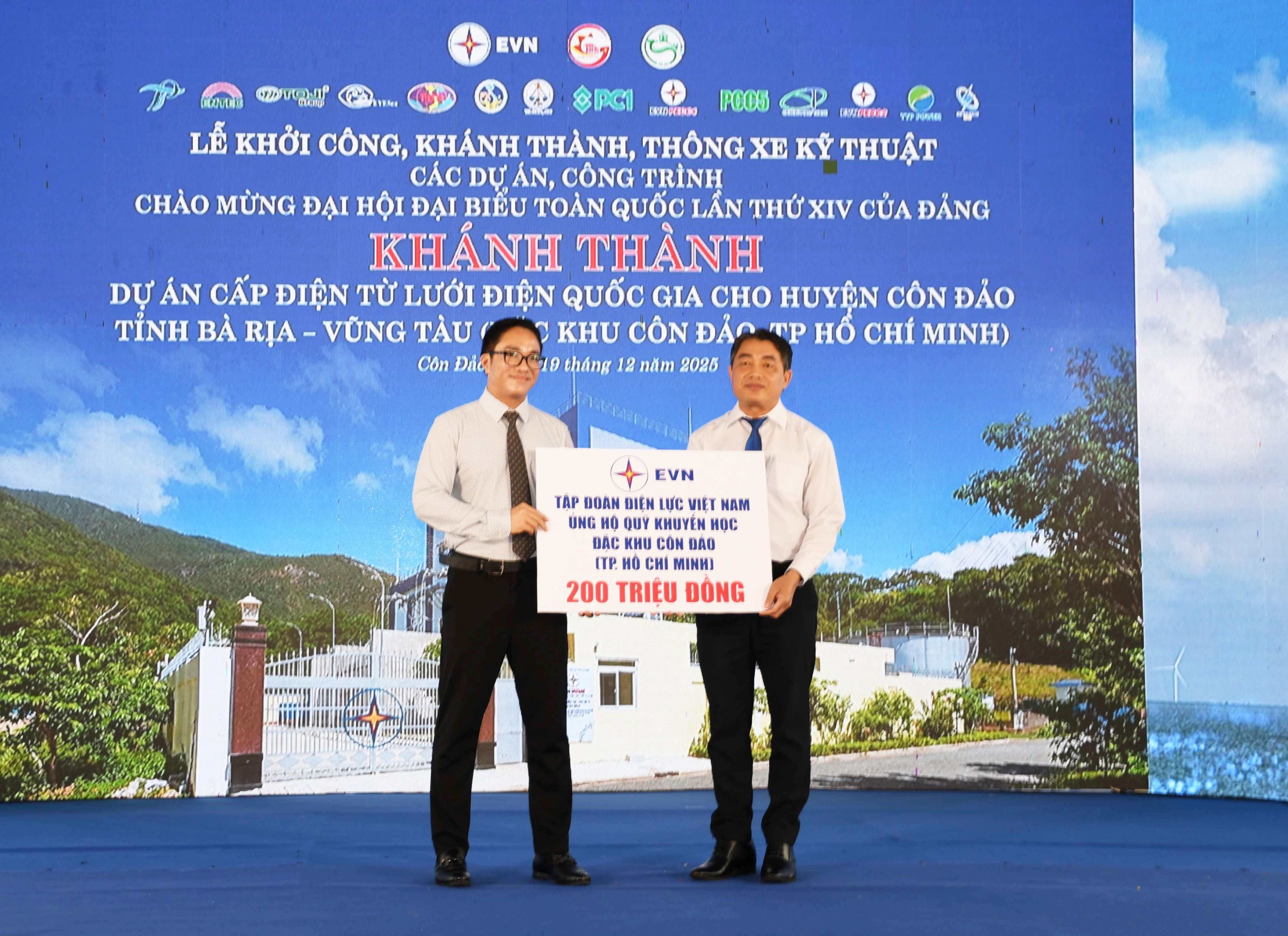 Nhân dịp Lễ khánh thành Dự án cấp điện từ điện lưới quốc gia cho đặc khu Côn Đảo, Tập đoàn Điện lực Việt Nam và đại diện các nhà thầu đã trao tặng kinh phí ủng hộ đặc khu Côn Đảo để thực hiện công tác an sinh xã hội, với tổng số tiền 500 triệu đồng.