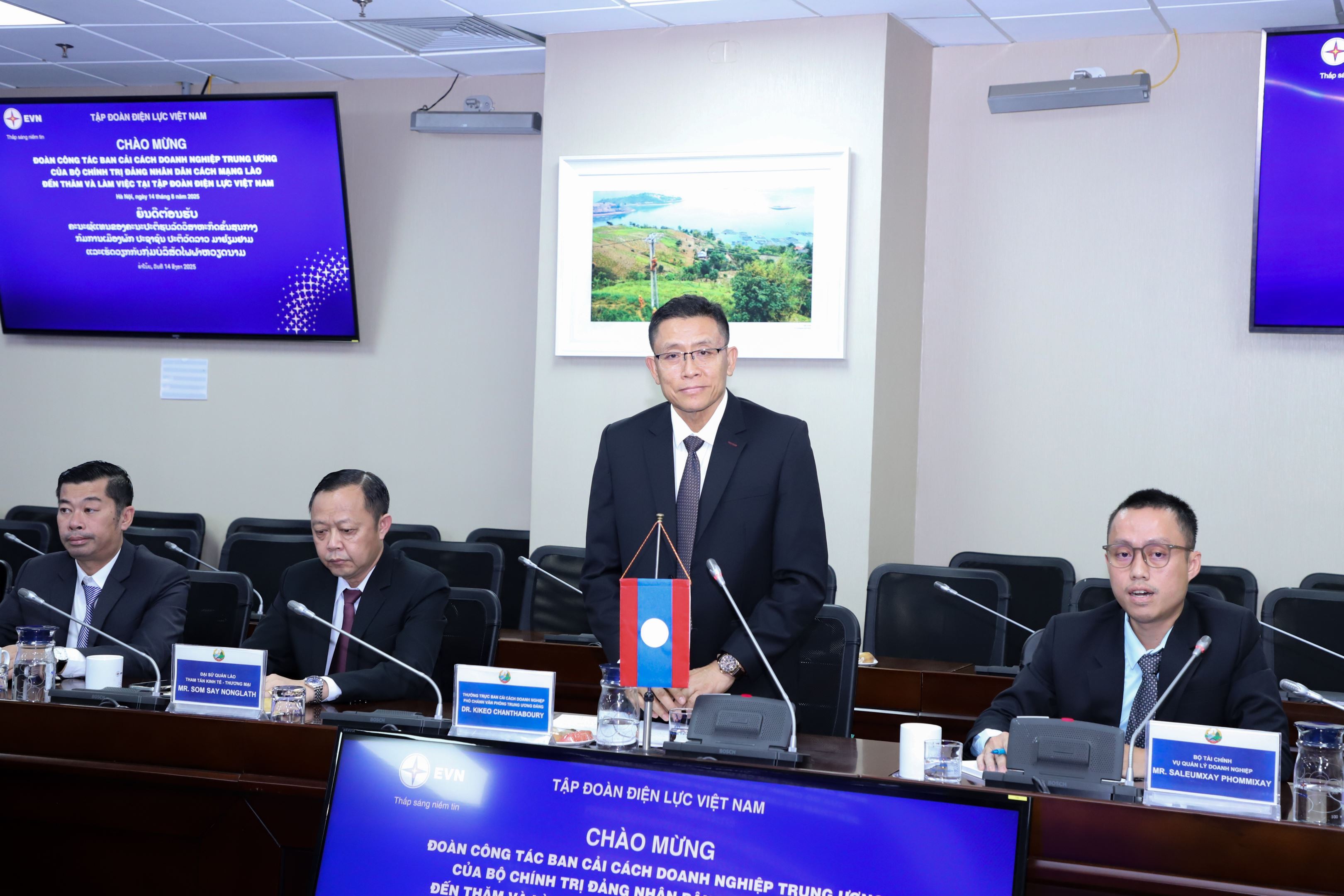 Tiến sĩ Kikeo Chanthaboury - Phó Chánh văn phòng Trung ương Đảng, Thường trực Ban Cải cách doanh nghiệp Trung ương Lào, cho biết Lào hiện có hơn 170 doanh nghiệp nhà nước hoạt động ở nhiều lĩnh vực. Để nâng cao hiệu quả, Chính phủ Lào đã thành lập Ban Cải cách doanh nghiệp Trung ương nhằm định hướng cải cách, củng cố năng lực quản trị và sức cạnh tranh. Tiến sĩ Kikeo Chanthaboury cảm ơn EVN đã dành thời gian tiếp đoàn và chia sẻ kinh nghiệm.