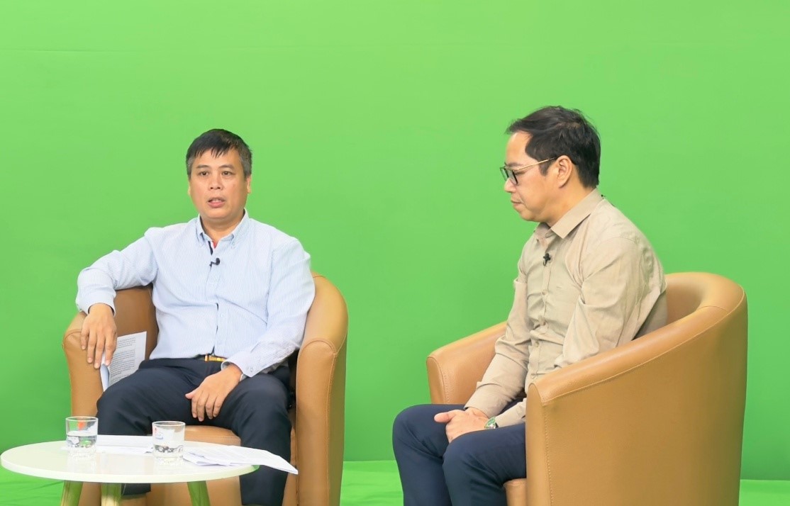 Phó Trưởng ban Kinh doanh và Mua bán điện EVN Nguyễn Mạnh Quang (bên trái) chia sẻ tại Tọa đàm “Đảm bảo điện 2026: Đẩy mạnh điện mặt trời mái nhà và thực hành tiết kiệm” được tổ chức tại trụ sở Báo Công thương, TP. Hà Nội, ngày 10/4/2026