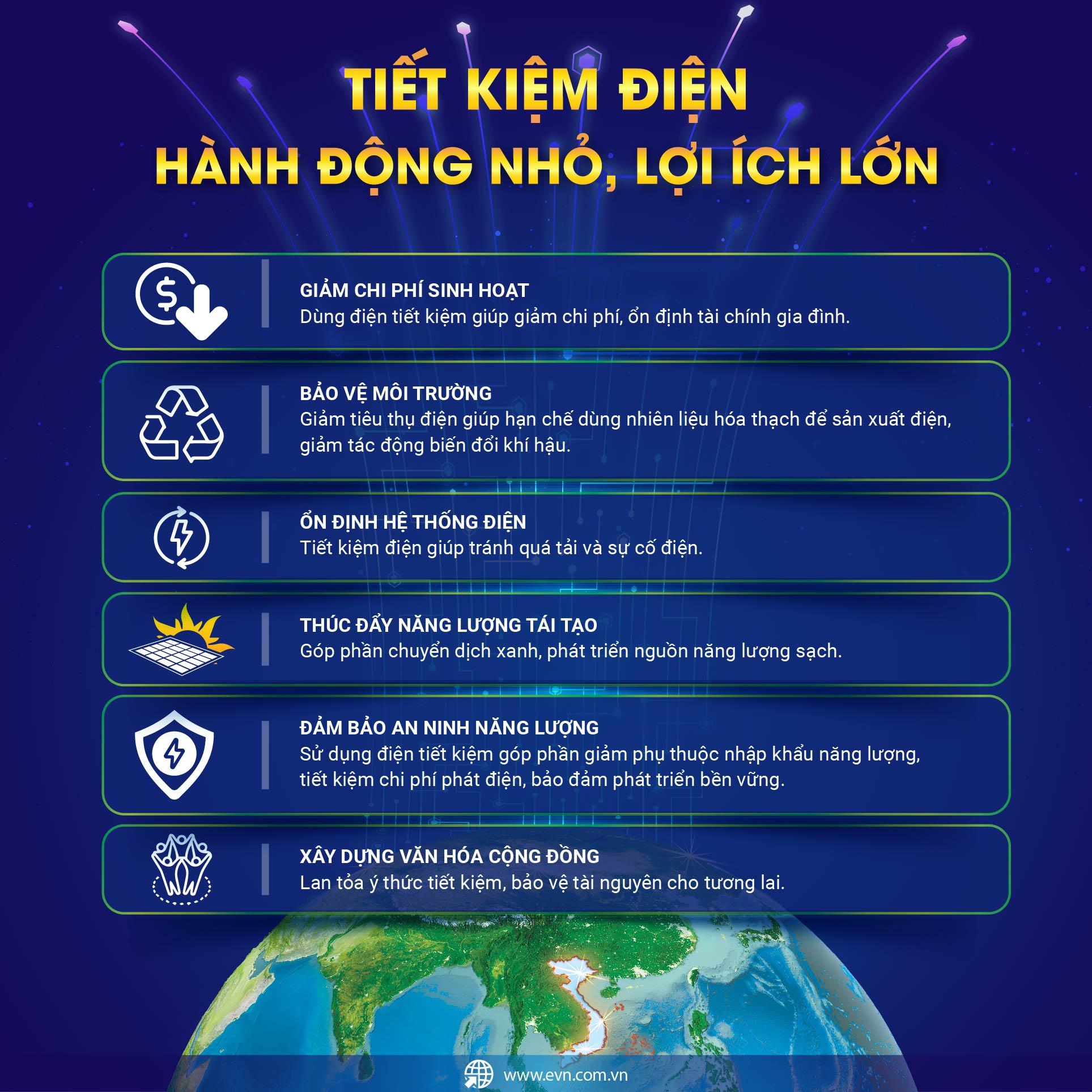 Chiến dịch Giờ Trái đất là sự kiện thường niên quy mô toàn cầu, được khởi xướng từ năm 2007, đến nay đã thu hút sự tham gia của gần 200 quốc gia và vùng lãnh thổ. Tại Việt Nam, chương trình do Bộ Công Thương và Tổ chức Quốc tế về Bảo tồn thiên nhiên (WWF) đồng chủ trì, với sự hưởng ứng của 34 tỉnh, thành phố cùng đông đảo các tầng lớp nhân dân. EVN là một trong những đơn vị tiêu biểu, luôn tích cực phối hợp để triển khai hiệu quả chương trình.