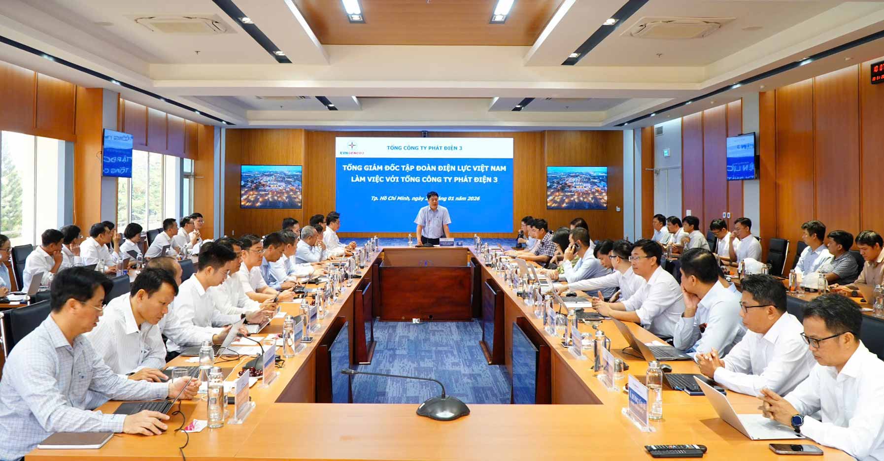 Sáng 20/1, tại TP. Hồ Chí Minh, đoàn công tác của Tập đoàn Điện lực Việt Nam (EVN) do Tổng giám đốc EVN Nguyễn Anh Tuấn dẫn đầu có buổi làm việc với Tổng Công ty Phát điện 3 (EVNGENCO3) về công tác bảo vệ môi trường và tình hình triển khai Dự án “Nâng cấp hệ thống xử lý khí thải các nhà máy nhiệt điện EVNGENCO3”.