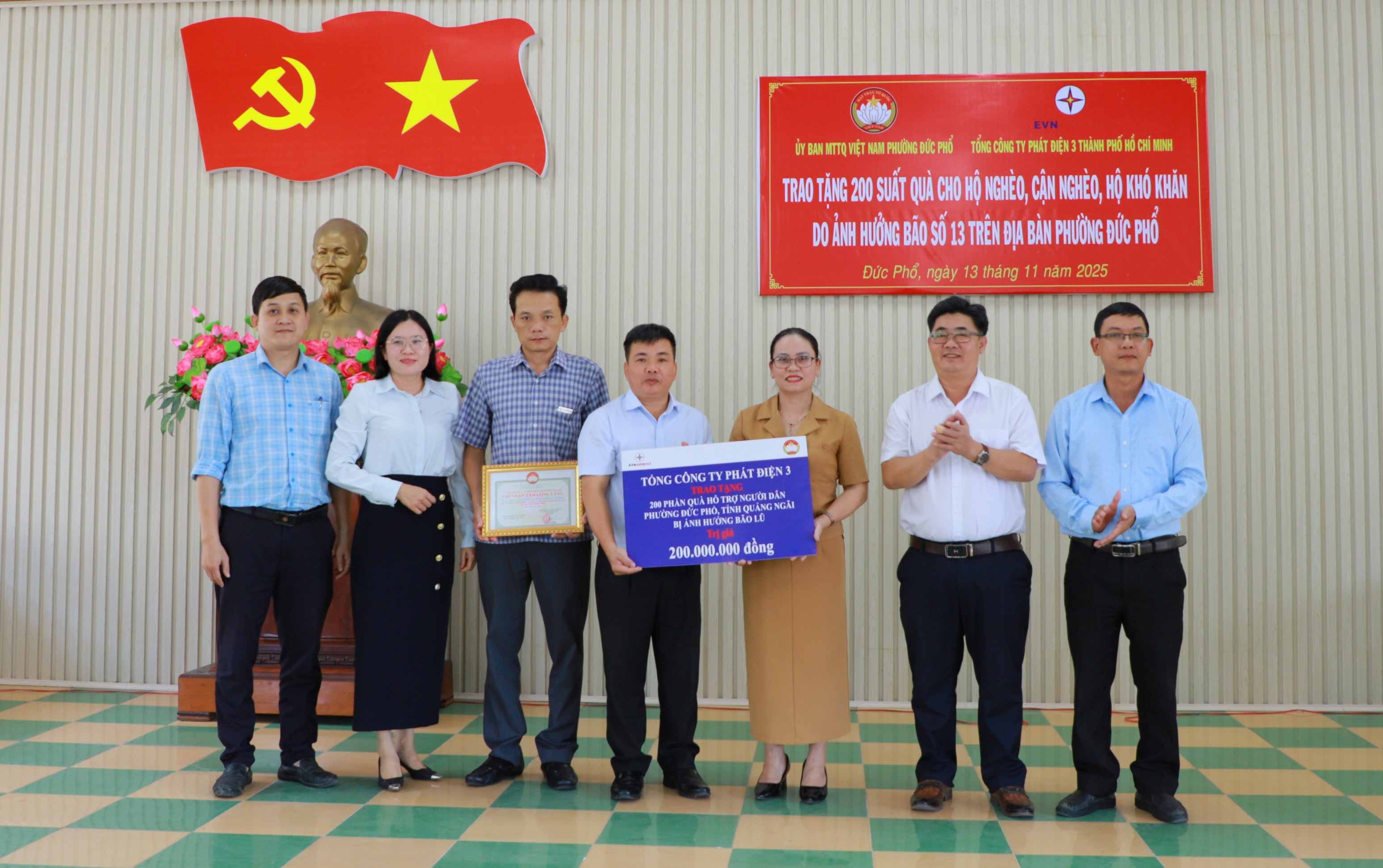 Đại diện EVNGENCO3 trao bảng tượng trưng phần quà hỗ trợ các gia đình có hoàn cảnh khó khăn do ảnh hưởng bão số 12, 13 cho đại diện lãnh đạo UBND, UBMTTQVN Phường Đức Phổ, tỉnh Quảng Ngãi