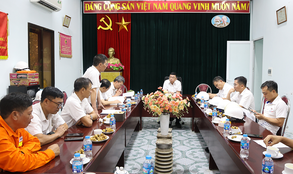 Tổng giám đốc EVNNPT Phạm Lê Phú và đoàn công tác nghe Đội Truyền tải điện Đông Bắc 2 báo cáo công tác chuẩn bị ứng phó trước bão số 3