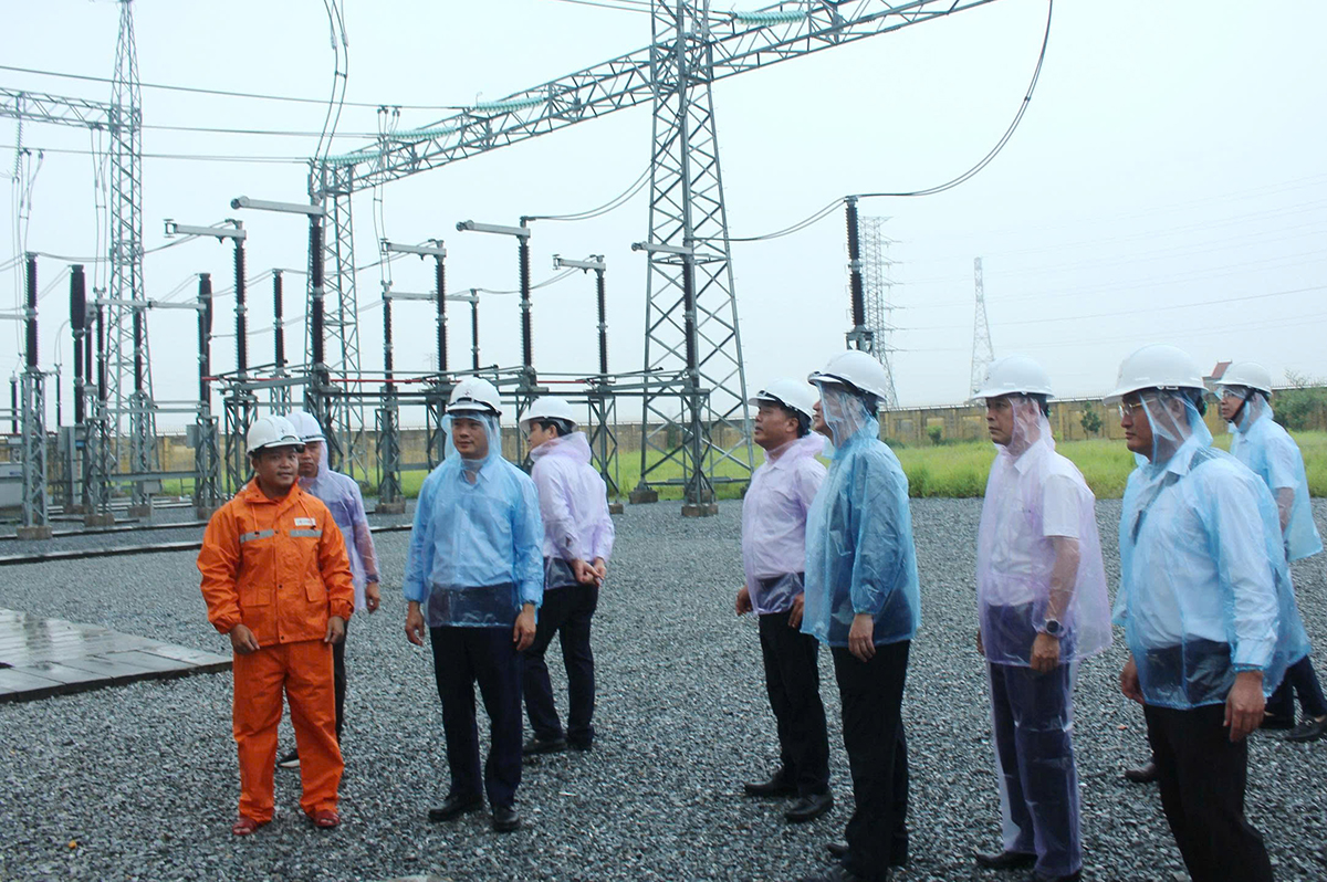 Phó Tổng giám đốc EVNNPT Lưu Việt Tiến (thứ hai, từ trái sang) kiểm tra công tác ứng phó trước bão số 3 tại Trạm biến áp 220kV Nam Định