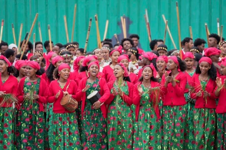 Phụ nữ Ethiopia mặc trang phục truyền thống ca múa trên đường phố trong ngày khánh thành siêu đập Đại Phục Hưng hôm 9/9. Ảnh: AP