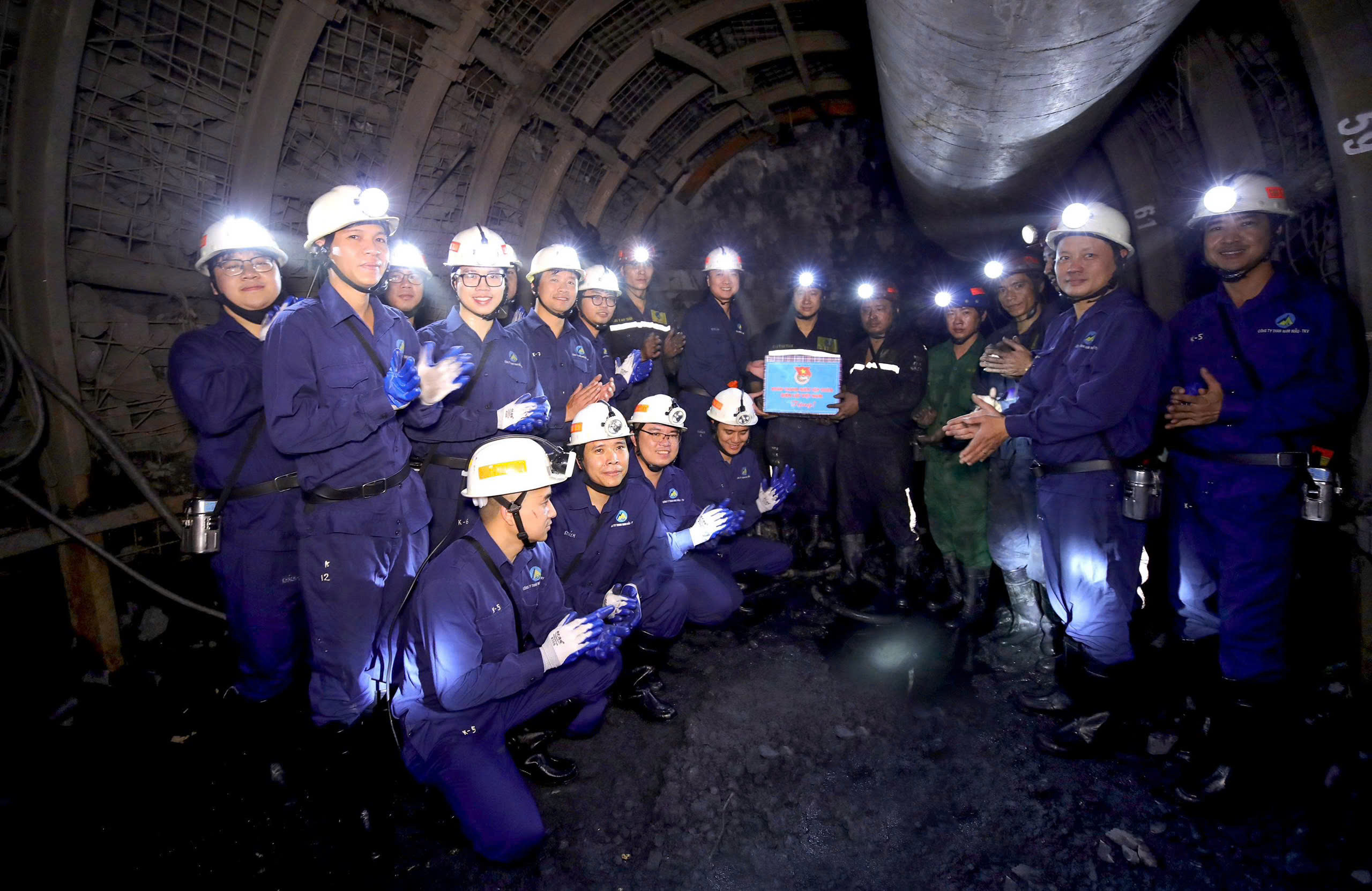 Đoàn Thanh niên EVN tặng quà các thanh niên công nhân tiêu biểu tại hầm lò mỏ Nam Mẫu. Ảnh: ĐVCC