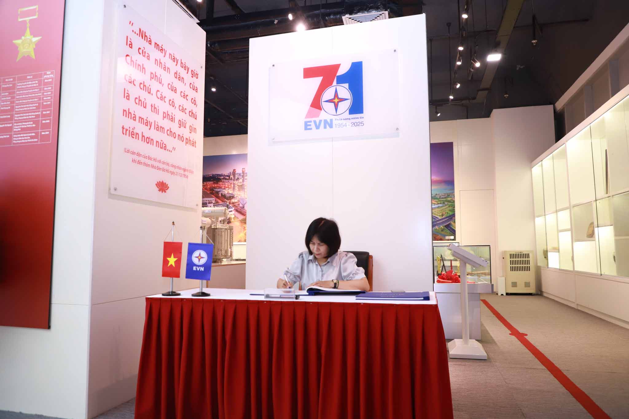 Hiệu trưởng Trường Tiểu học Việt Nam – Cu Ba Trần Thị Tố Trinh ghi lưu bút tại Nhà truyền thống ngành Điện lực Việt Nam