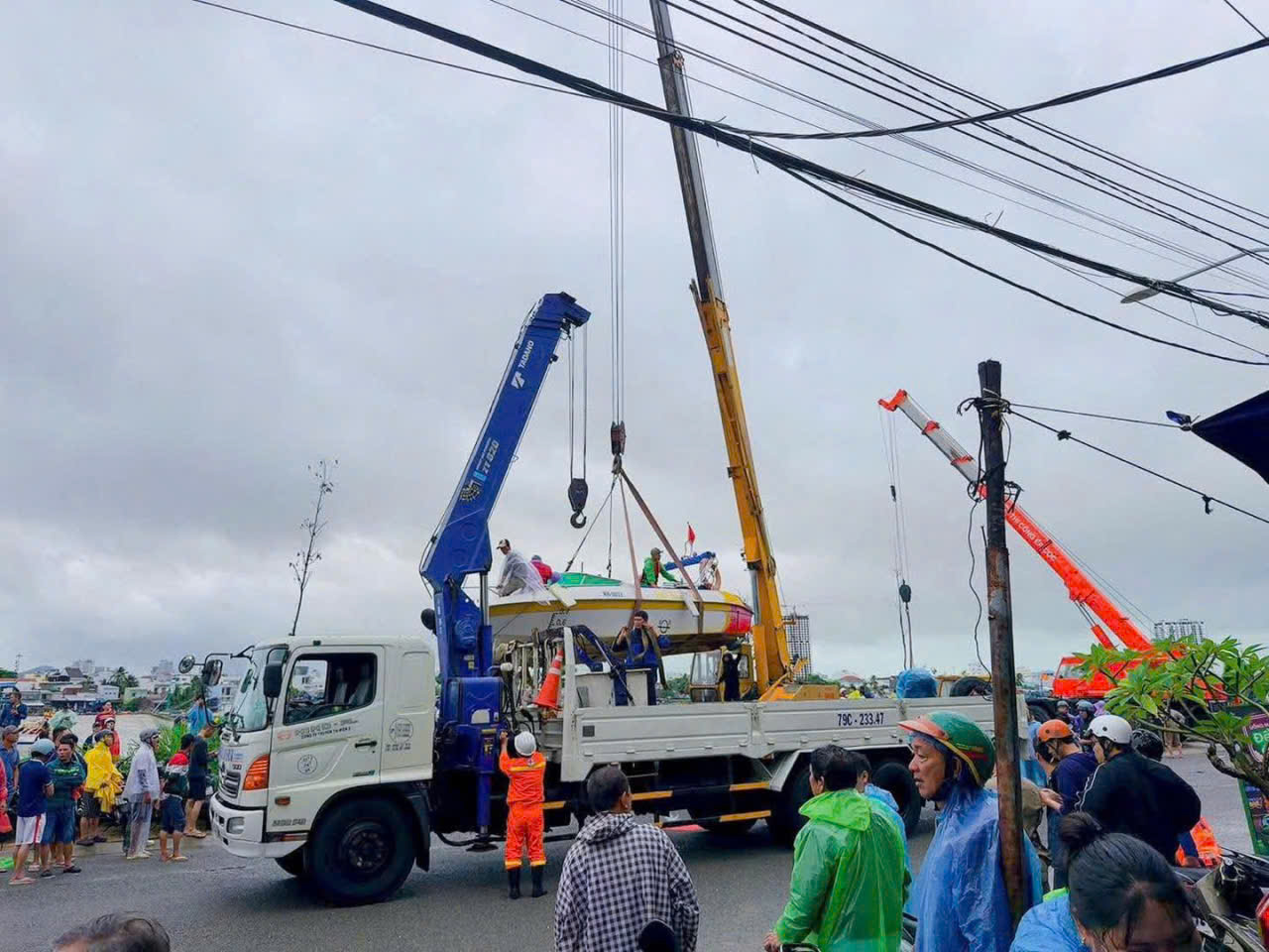 Tại hiện trường, xe cẩu chuyên dụng của 2 đơn vị PTC2 và PC Khánh Hòa được điều động để chở cano, hỗ trợ lực lượng cứu hộ di chuyển, tiếp cận các khu vực ngập sâu, đang bị cô lập.